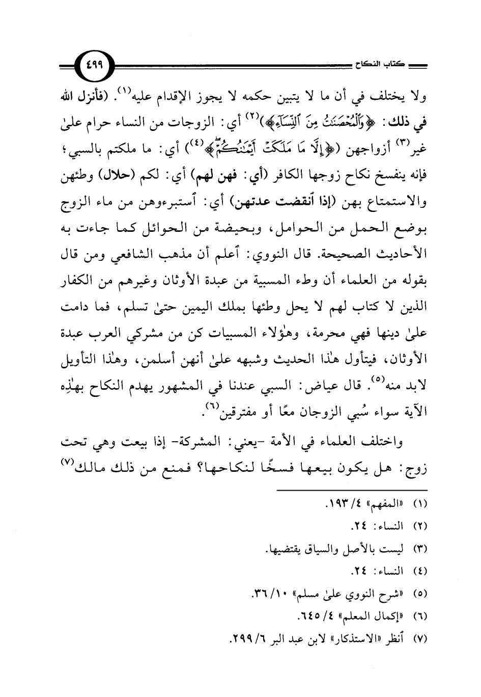 ولا يختلف في أن ما لا يتبين حكمه لا يجوز الإقدام عليه (¬1). (فأنزل الله في ذلك: {وَالْمُحْصَنَاتُ مِنَ النِّسَاءِ}) (¬2) أي: الزوجات من النساء حرام على غير (¬3) أزواجهن ({إِلَّا مَا مَلَكَتْ أَيْمَانُكُمْ}) (¬4) أي: ما ملكتم بالسبي؛ فإنه ينفسخ نكاح زوجها الكافر (أي: فهن لهم) أي: لكم (حلال) وطئهن والاستمتاع بهن (إذا انقضت عدتهن) أي: استبرءوهن من ماء الزوج بوضع الحمل من الحوامل، وبحيضة من الحوائل كما جاءت به الأحاديث الصحيحة. قال النووي: اعلم أن مذهب الشافعي ومن قال بقوله من العلماء أن وطء المسبية من عبدة الأوثان وغيرهم من الكفار الذين لا كتاب لهم لا يحل وطئها بملك اليمين حتى تسلم، فما دامت على دينها فهي محرمة، وهؤلاء المسبيات كن من مشركي العرب عبدة الأوثان، فيتأول هذا الحديث وشبهه على أنهن أسلمن، وهذا التأويل لا بد منه (¬5). قال عياض: السبي عندنا في المشهور يهدم النكاح بهذِه الآية سواء سُبي الزوجان معًا أو مفترقين (¬6).