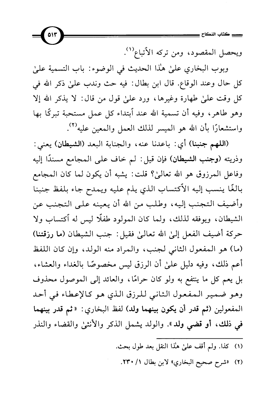 (اللهم جنبنا) أي: باعدنا عنه، والجنابة البعد (الشيطان) يعني: وذريته (وجنب الشيطان) فإن قيل: لم خاف على المجامع مسندًا إليه وفاعل المرزوق هو الله تعالى؟ قلت: يشبه أن يكون لما كان المجامع بالغًا ينسب إليه الاكتساب الذي يذم عليه ويمدح جاء بلفظ جنبنا وأضيف التجنب إليه، وطلب من الله أن يعينه على التجنب عن الشيطان، ويوفقه لذلك، ولما كان المولود طفلًا ليس له اكتساب ولا حركة أضيف الفعل إلى الله تعالى فقيل: جنب الشيطان (ما رزقتنا) (ما) هو المفعول الثاني لجنب، والمراد منه الولد، وإن كان اللفظ أعم ذلك، وفيه دليل على أن الرزق ليس مخصوصًا بالغداء والعشاء، بل يعم كل ما ينتفع به ولو كان حرامًا، والعائد إلى الموصول محذوف وهو ضمير المفعول الثاني للرزق الذي هو كالإعطاء في أحد المفعولين (ثم قدر أن يكون بينهما ولد) لفظ البخاري: "ثم قدر بينهما في ذلك، أو قضي ولد". والولد يشمل الذكر والأنثى والقضاء والنذر