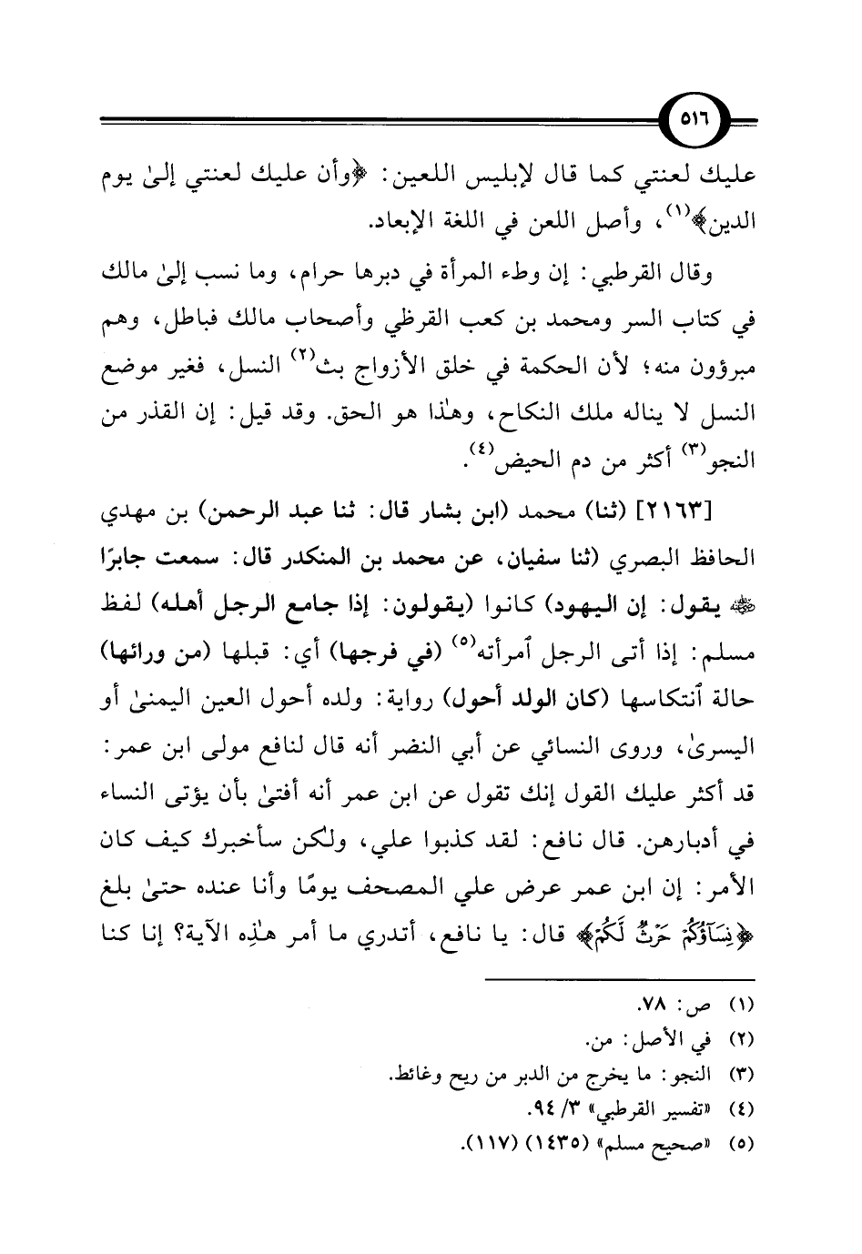 [2163] (ثنا) محمد (ابن بشار قال: ثنا عبد الرحمن) بن مهدي الحافظ البصري (ثنا سفيان، عن محمد بن المنكدر قال: سمعت جابرًا - رضي الله عنه - يقول: إن اليهود) كانوا (يقولون: إذا جامع الرجل أهله) لفظ مسلم: إذا أتى الرجل امرأته (¬5) (في فرجها) أي: قبلها (من ورائها) حالة انتكاسها (كان الولد أحول) رواية: ولده أحول العين اليمنى أو اليسرى، وروى النسائي عن أبي النضر أنه قال لنافع مولى ابن عمر: قد أكثر عليك القول إنك تقول عن ابن عمر أنه أفتى بأن يؤتى النساء في أدبارهن. قال نافع: لقد كذبوا علي، ولكن سأخبرك كيف كان الأمر: إن ابن عمر عرض علي المصحف يومًا وأنا عنده حتى بلغ {نِسَاؤُكُمْ حَرْثٌ لَكُمْ} قال: يا نافع، أتدري ما أمر هذِه الآية؟ إنا كنا