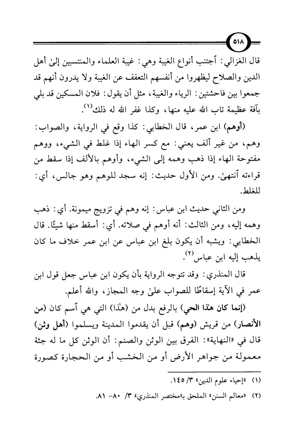 ومن الثاني حديث ابن عباس: إنه وهم في تزويج ميمونة. أي: ذهب وهمه إليه، ومن الثالث: أنه أوهم في صلاته. أي: أسقط منها شيئًا. قال الخطابي: ويشبه أن يكون بلغ ابن عباس عن ابن عمر خلاف ما كان يذهب إليه ابن عباس (¬2).