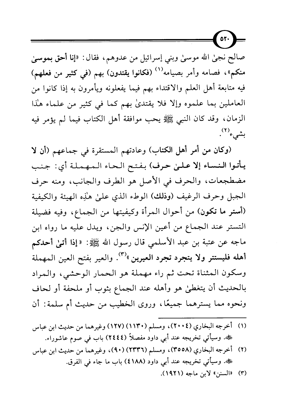 صالح نجى الله موسى وبني إسرائيل من عدوهم، فقال: "إنا أحق بموسى منكم"، فصامه وأمر بصيامه (¬1) (فكانوا يقتدون) بهم (في كثير من فعلهم) فيه متابعة أهل العلم والاقتداء بهم فيما يفعلونه ويأمرون به إذا كانوا من العاملين بما علموه وإلا فلا يقتدى بهم كما في كثير من علماء هذا الزمان، وقد كان النبي - صلى الله عليه وسلم - يحب موافقة أهل الكتاب فيما لم يؤمر فيه بشيء (¬2).