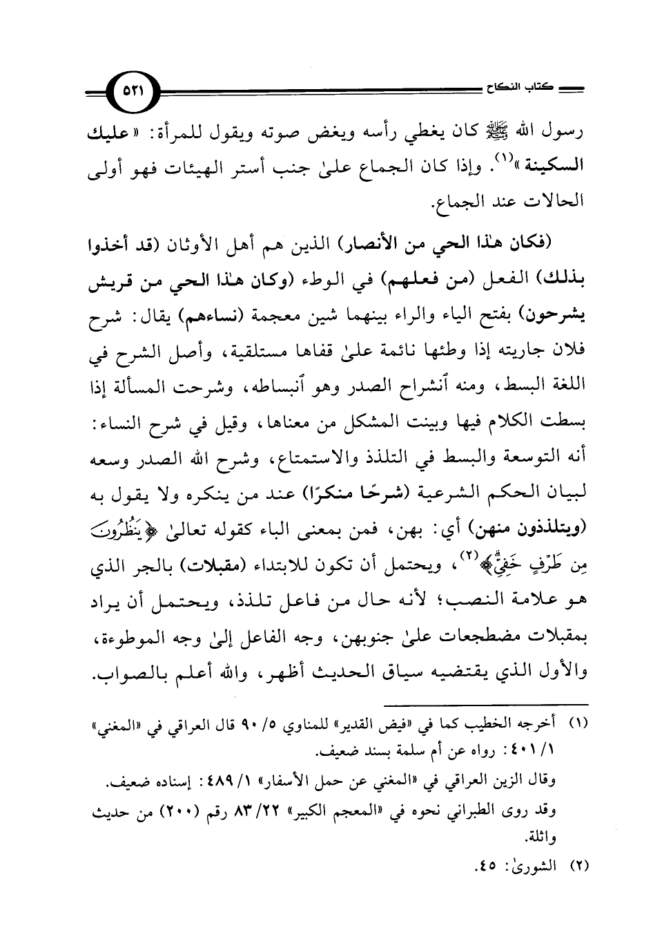 (فكان هذا الحي من الأنصار) الذين هم أهل الأوثان (قد أخذوا بذلك) الفعل (من فعلهم) في الوطء (وكان هذا الحي من قريش يشرحون) بفتح الياء والراء بينهما شين معجمة (نساءهم) يقال: شرح فلان جاريته إذا وطئها نائمة على قفاها مستلقية، وأصل الشرح في اللغة البسط، ومنه انشراح الصدر وهو انبساطه، وشرحت المسألة إذا بسطت الكلام فيها وبينت المشكل من معناها، وقيل في شرح النساء: أنه التوسعة والبسط في التلذذ والاستمتاع، وشرح الله الصدر وسعه لبيان الحكم الشرعية (شرحًا منكرًا) عند من ينكره ولا يقول به (ويتلذذون منهن) أي: بهن، فمن بمعنى الباء كقوله تعالى {يَنْظُرُونَ مِنْ طَرْفٍ خَفِيٍّ} (¬2)، ويحتمل أن تكون للابتداء (مقبلات) بالجر الذي هو علامة النصب؛ لأنه حال من فاعل تلذذ، ويحتمل أن يراد بمقبلات مضطجعات على جنوبهن، وجه الفاعل إلى وجه الموطوءة، والأول الذي يقتضيه سياق الحديث أظهر، والله أعلم بالصواب.
