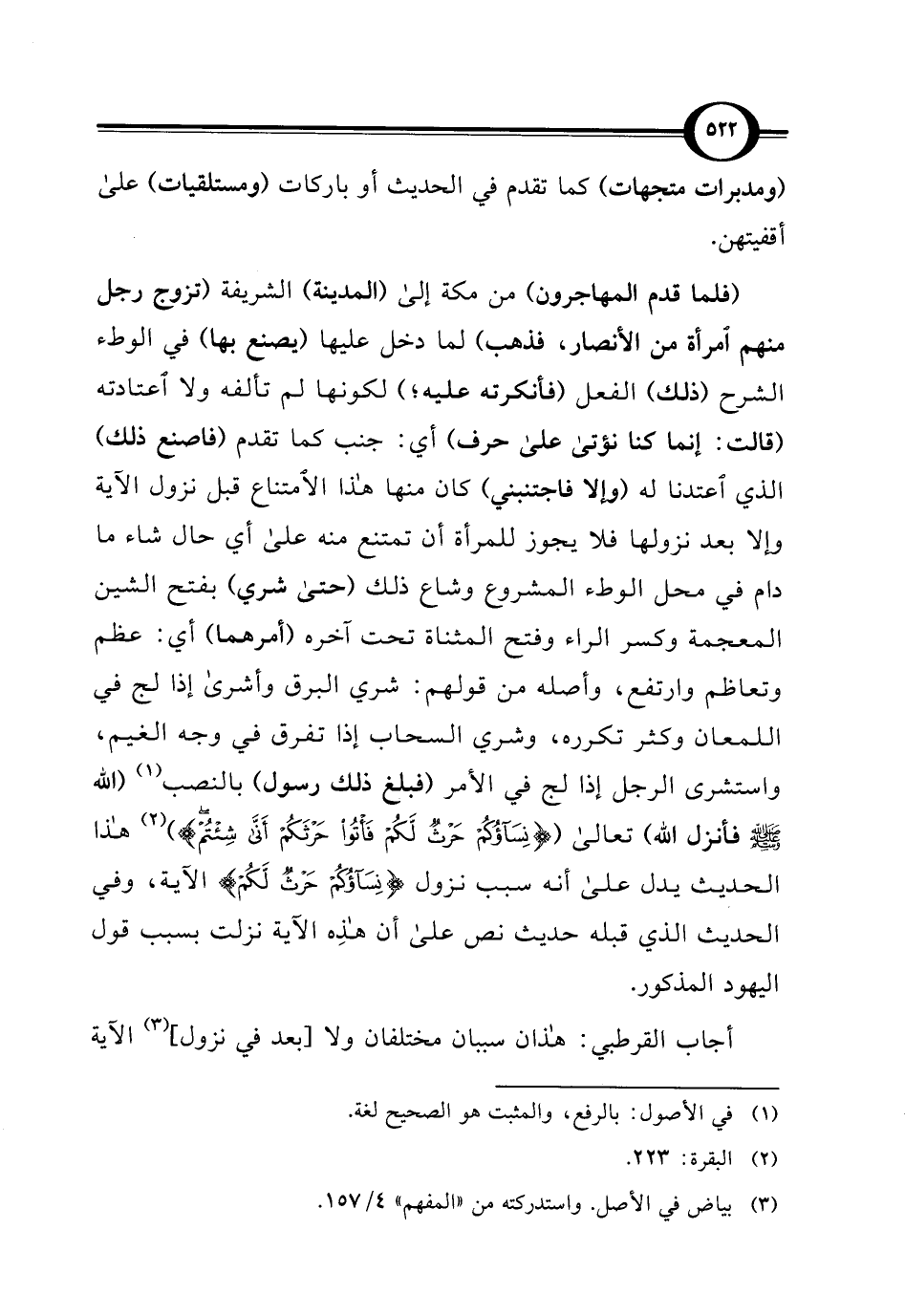 (فلما قدم المهاجرون) من مكة إلى (المدينة) الشريفة (تزوج رجل منهم امرأة من الأنصار، فذهب) لما دخل عليها (يصنع بها) في الوطء الشرح (ذلك) الفعل (فأنكرته عليه؛ ) لكونها لم تألفه ولا اعتادته (قالت: إنما كنا نؤتى على حرف) أي: جنب كما تقدم (فاصنع ذلك) الذي اعتدنا له (وإلا فاجتنبني) كان منها هذا الامتناع قبل نزول الآية وإلا بعد نزولها فلا يجوز للمرأة أن تمتنع منه على أي حال شاء ما دام في محل الوطء المشروع وشاع ذلك (حتى شري) بفتح الشين المعجمة وكسر الراء وفتح المثناة تحت آخره (أمرهما) أي: عظم وتعاظم وارتفع، وأصله من قولهم: شري البرق وأشرى إذا لج في اللمعان وكثر تكرره، وشري السحاب إذا تفرق في وجه الغيم، واستشرى الرجل إذا لج في الأمر (فبلغ ذلك رسول) بالنصب (¬1) (الله - صلى الله عليه وسلم - فأنزل الله) تعالى ({نِسَاؤُكُمْ حَرْثٌ لَكُمْ فَأْتُوا حَرْثَكُمْ أَنَّى شِئْتُمْ}) (¬2) هذا الحديث يدل على أنه سبب نزول {نِسَاؤُكُمْ حَرْثٌ لَكُمْ} الآية، وفي الحديث الذي قبله حديث نص على أن هذِه الآية نزلت بسبب قول اليهود المذكور.