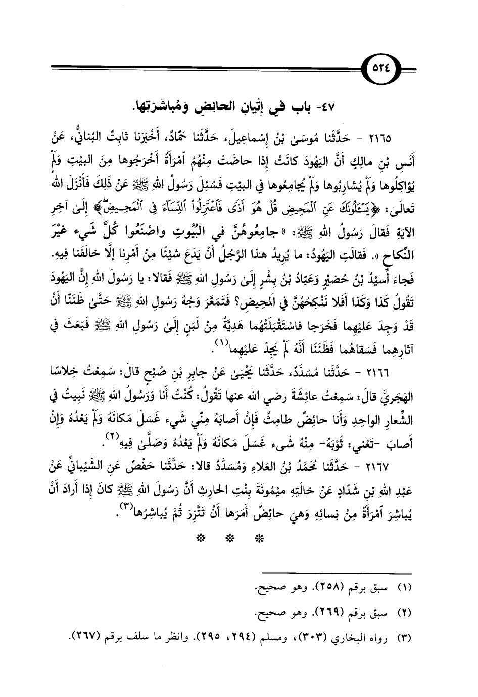 2165 - حَدَّثَنا مُوسَى بْنُ إِسْماعِيلَ، حَدَّثَنا حَمَّادٌ، أَخْبَرَنَا ثابِتٌ البُنَانيُّ، عَنْ أَنَسِ بْنِ مالِكٍ أَنَّ اليَهُودَ كَانَتْ إِذَا حَاضَتْ مِنْهُمُ امْرَأَةٌ أَخْرَجُوها مِنَ البيْتِ وَلَمْ يُؤاكِلُوها وَلَمْ يُشَارِبُوها وَلَمْ يُجَامِعُوها في البيْتِ فَسُئِلَ رَسُولُ اللهِ - صلى الله عليه وسلم - عَنْ ذَلِكَ فَأَنْزَلَ اللهُ تَعالَى: {وَيَسْأَلُونَكَ عَنِ الْمَحِيضِ قُلْ هُوَ أَذًى فَاعْتَزِلُوا النِّسَاءَ فِي الْمَحِيضِ} إِلَى آخِرِ الآيَةِ فَقَالَ رَسُولُ اللهِ - صلى الله عليه وسلم -: "جامِعُوهُنَّ في البُيُوتِ واصْنَعُوا كُلَّ شَيءٍ غيْرَ النِّكَاحِ". فَقالَتِ اليَهُودُ: ما يُرِيدُ هذا الرَّجُلُ أَنْ يَدَعَ شيْئًا مِنْ أَمْرِنا إِلَّا خَالَفَنا فِيهِ. فَجاءَ أُسيْدُ بْنُ حُضَيْرٍ وَعَبَّادُ بْنُ بِشْرٍ إِلَى رَسُولِ اللهِ - صلى الله عليه وسلم - فَقَالا: يا رَسُولَ اللهِ إِنَّ اليَهُودَ تَقُولُ كَذا وَكَذا أَفَلا نَنْكِحُهُنَّ في المَحِيضِ؟ فَتَمَعَّرَ وَجْهُ رَسُولِ اللهِ - صلى الله عليه وسلم - حَتَّى ظَنَنَّا أَنْ قَدْ وَجِدَ عَليْهِما فَخَرَجا فاسْتَقْبَلَتْهُما هَدِيَّةٌ مِنْ لَبَنٍ إِلَى رَسُولِ اللهِ - صلى الله عليه وسلم - فَبَعَثَ في آثارِهِما فَسَقافما فَظَنَنّا أَنَّهُ لَمْ يَجِدْ عَليْهِمَا (¬1).