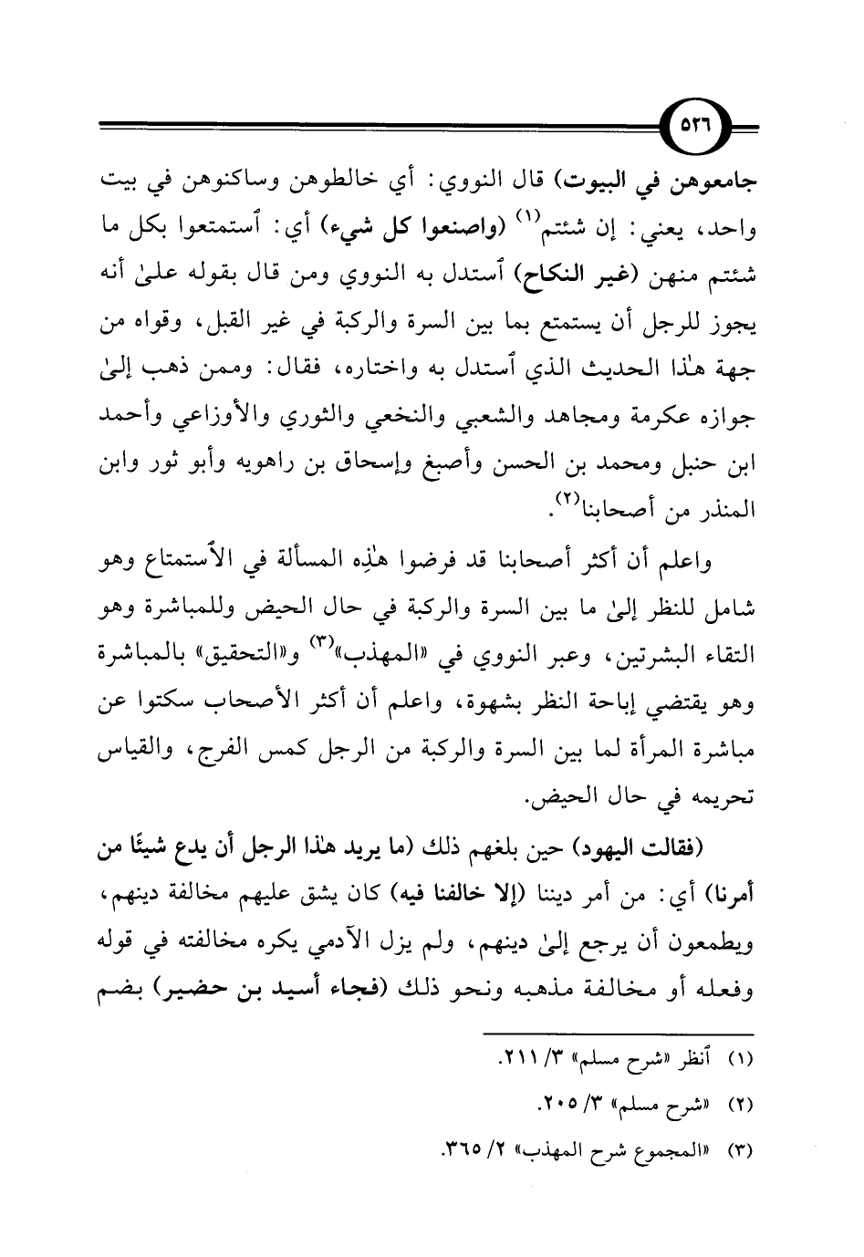 جامعوهن في البيوت) قال النووي: أي خالطوهن وساكنوهن في بيت واحد، يعني: إن شئتم (¬1) (واصنعوا كل شيء) أي: استمتعوا بكل ما شئتم منهن (غير النكاح) استدل به النووي ومن قال بقوله على أنه يجوز للرجل أن يستمتع بما بين السرة والركبة في غير القبل، وقواه من جهة هذا الحديث الذي استدل به واختاره، فقال: وممن ذهب إلى جوازه عكرمة ومجاهد والشعبي والنخعي والثوري والأوزاعي وأحمد بن حنبل ومحمد بن الحسن وأصبغ وإسحاق بن راهويه وأبو ثور وابن المنذر من أصحابنا (¬2).