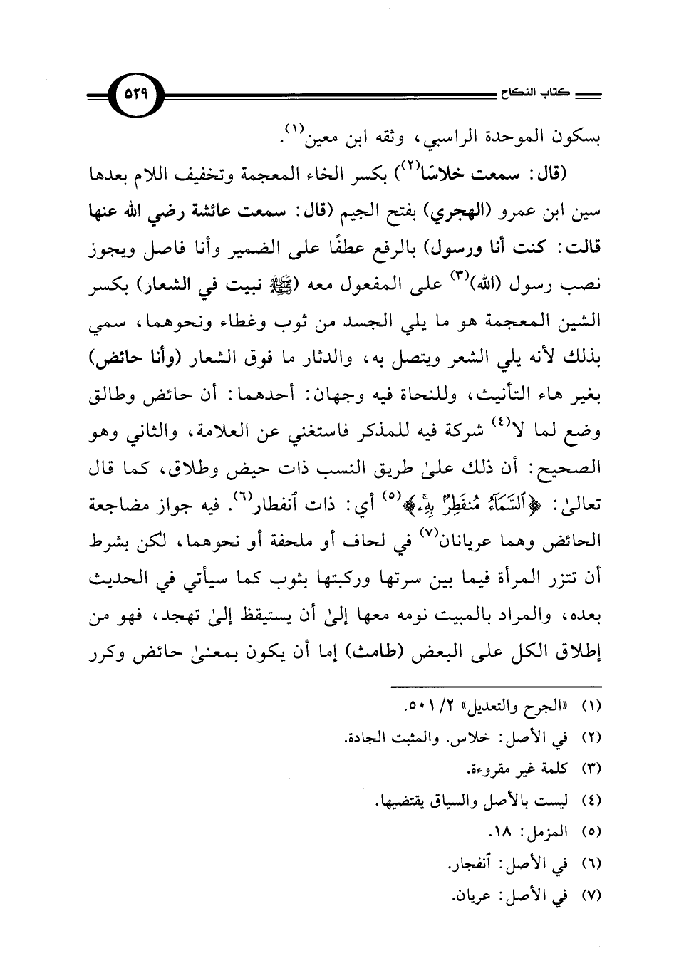 (قال: سمعت خلاسًا) (¬2) بكسر الخاء المعجمة وتخفيف اللام بعدها سين ابن عمرو (الهجري) بفتح الجيم (قال: سمعت عائشة رضي الله عنها قالت: كنت أنا ورسول) بالرفع عطفًا على الضمير وأنا فاصل ويجوز نصب رسول (الله) (¬3) على المفعول معه (- صلى الله عليه وسلم - نبيت في الشعار) بكسر الشين المعجمة هو ما يلي الجسد من ثوب وغطاء ونحوهما، سمي بذلك لأنه يلي الشعر ويتصل به، والدثار ما فوق الشعار (وأنا حائض) بغير هاء التأنيث، وللنحاة فيه وجهان: أحدهما: أن حائض وطالق وضع لما لا (¬4) شركة فيه للمذكر فاستغني عن العلامة، والثاني وهو الصحيح: أن ذلك على طريق النسب ذات حيض وطلاق، كما قال تعالى: {السَّمَاءُ مُنْفَطِرٌ بِهِ} (¬5) أي: ذات انفطار (¬6). فيه جواز مضاجعة الحائض وهما عريانان (¬7) في لحاف أو ملحفة أو نحوهما، لكن بشرط أن تتزر المرأة فيما بين سرتها وركبتها بثوب كما سيأتي في الحديث بعده، والمراد بالمبيت نومه معها إلى أن يستيقظ إلى تهجد، فهو من إطلاق الكل على البعض (طامث) إما أن يكون بمعنى حائض وكرر