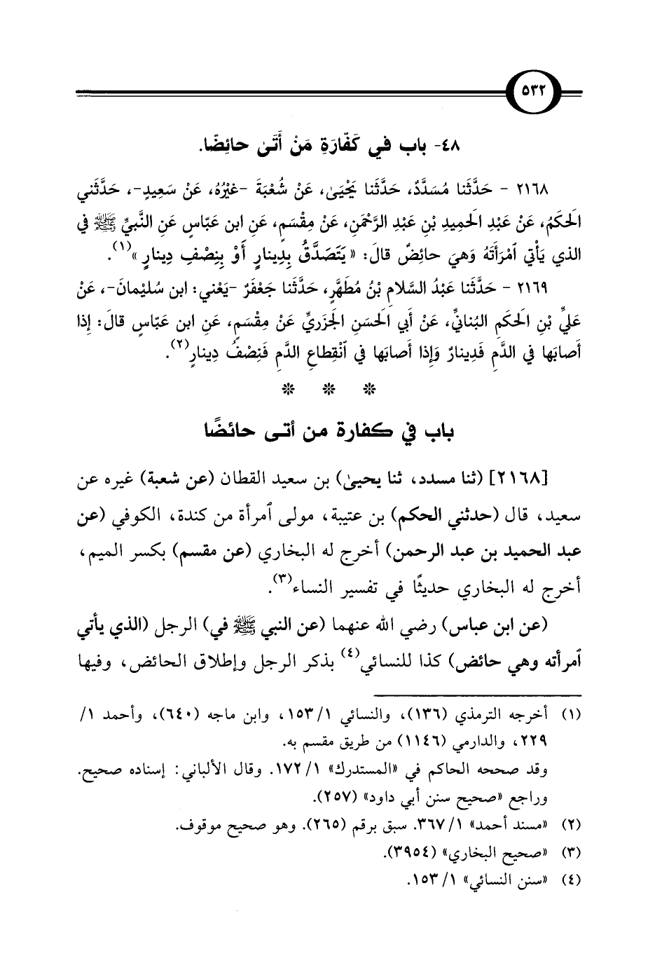 2168 - حَدَّثَنا مُسَدَّدٌ، حَدَّثَنا يَحْيَى، عَنْ شُعْبَةَ - غيْرُهُ، عَنْ سَعِيدٍ -، حَدَّثَنِي الحَكَمُ، عَنْ عَبْدِ الحَمِيدِ بْنِ عَبْدِ الرَّحْمَنِ، عَنْ مِقْسَمٍ، عَنِ ابن عَبَّاسٍ عَنِ النَّبيِّ - صلى الله عليه وسلم - فِي الذي يَأْتي امْرَأَتَهُ وَهيَ حائِضٌ قَالَ: "يَتَصَدَّقُ بِدِينارٍ أَوْ بِنِصْفِ دِينارٍ" (¬1).