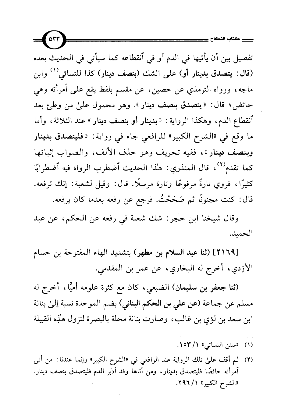 (¬2) لم أقف على تلك الرواية عند الرافعي في "الشرح الكبير" وإنما عندنا: من أتى امرأته حائضًا فليتصدق بدينار، ومن أتاها وقد أدبَر الدم فليتصدق بنصف دينار. "الشرح الكبير" 1/ 296.