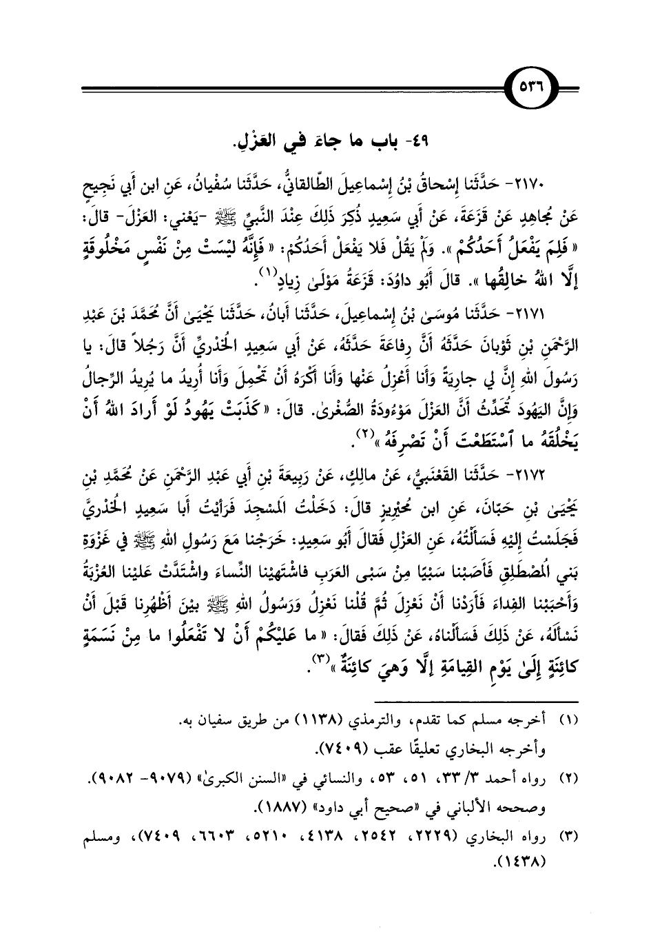 2172 - حَدَّثَنا القَعْنَبيُّ، عَنْ مالِكٍ، عَنْ رَبِيعَةَ بْنِ أَبي عَبْدِ الرَّحْمَنِ عَنْ مُحَمَّدِ بْنِ يَحْيَى بْنِ حَبّانَ، عَنِ ابن مُحيْرِيزٍ قَالَ: دَخَلْت المَسْجِدَ فَرَأيْت أَبا سَعِيدٍ الخُدْريَّ فَجَلَسْتُ إِليْهِ فَسَأَلْتُهُ، عَنِ العَزْلِ فَقَالَ أَبُو سَعِيدٍ: خَرَجْنَا مَعَ رَسُولِ اللهِ - صلى الله عليه وسلم - في غَزْوَةِ بَنِي المُصْطَلِقِ فَأَصَبْنا سَبْيًا مِنْ سَبْى العَرَبِ فاشْتَهيْنا النِّسَاءَ واشْتَدَّتْ عَليْنا العُزْبَةُ وَأَحْبَبْنا الفِداءَ فَأَرَدْنَا أَنْ نَعْزِلَ ثُمَّ قُلْنا نَعْزِل وَرَسُولُ اللهِ - صلى الله عليه وسلم - بيْنَ أَظْهُرِنَا قَبْلَ أَنْ نَسْأَلهُ، عَنْ ذَلِكَ فَسَأَلْنَاهُ، عَنْ ذَلِكَ فَقَالَ: "ما عَليْكُمْ أَنْ لا تَفْعَلُوا ما مِنْ نَسَمَةٍ كائِنَةٍ إِلَى يَوْمِ القِيامَةِ إِلَّا وَهيَ كائِنَةٌ" (¬3).
