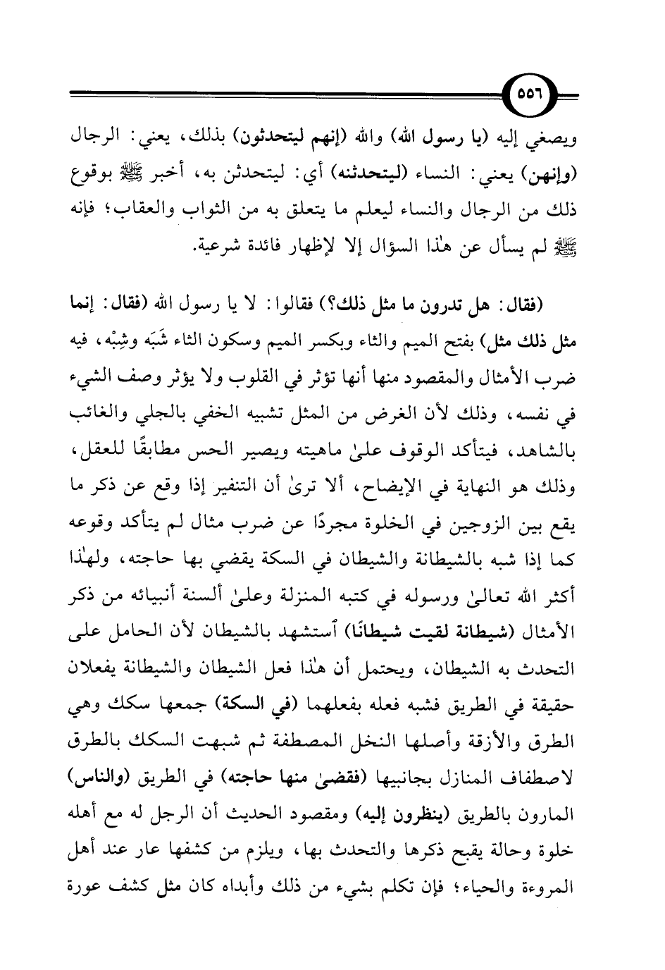 (فقال: هل تدرون ما مثل ذلك؟ ) فقالوا: لا يا رسول الله (فقال: إنما مثل ذلك مثل) بفتح الميم والثاء وبكسر الميم وسكون الثاء شَبَه وشِبْه، فيه ضرب الأمثال والمقصود منها أنها تؤثر في القلوب ولا يؤثر وصف الشيء في نفسه، وذلك لأن الغرض من المثل تشبيه الخفي بالجلي والغائب بالشاهد، فيتأكد الوقوف على ماهيته ويصير الحس مطابقًا للعقل، وذلك هو النهاية في الإيضاح، ألا ترى أن التنفير إذا وقع عن ذكر ما يقع بين الزوجين في الخلوة مجردًا عن ضرب مثال لم يتأكد وقوعه كما إذا شبه بالشيطانة والشيطان في السكة يقضي بها حاجته، ولهذا أكثر الله تعالى ورسوله في كتبه المنزلة وعلى ألسنة أنبيائه من ذكر الأمثال (شيطانة لقيت شيطانًا) استشهد بالشيطان لأن الحامل على التحدث به الشيطان، ويحتمل أن هذا فعل الشيطان والشيطانة يفعلان حقيقة في الطريق فشبه فعله بفعلهما (في السكة) جمعها سكك وهي الطرق والأزقة وأصلها النخل المصطفة ثم شبهت السكك بالطرق لاصطفاف المنازل بجانبيها (فقضى منها حاجته) في الطريق (والناس) المارون بالطريق (ينظرون إليه) ومقصود الحديث أن الرجل له مع أهله خلوة وحالة يقبح ذكرها والتحدث بها، ويلزم من كشفها عار عند أهل المروءة والحياء؛ فإن تكلم بشيء من ذلك وأبداه كان مثل كشف عورة