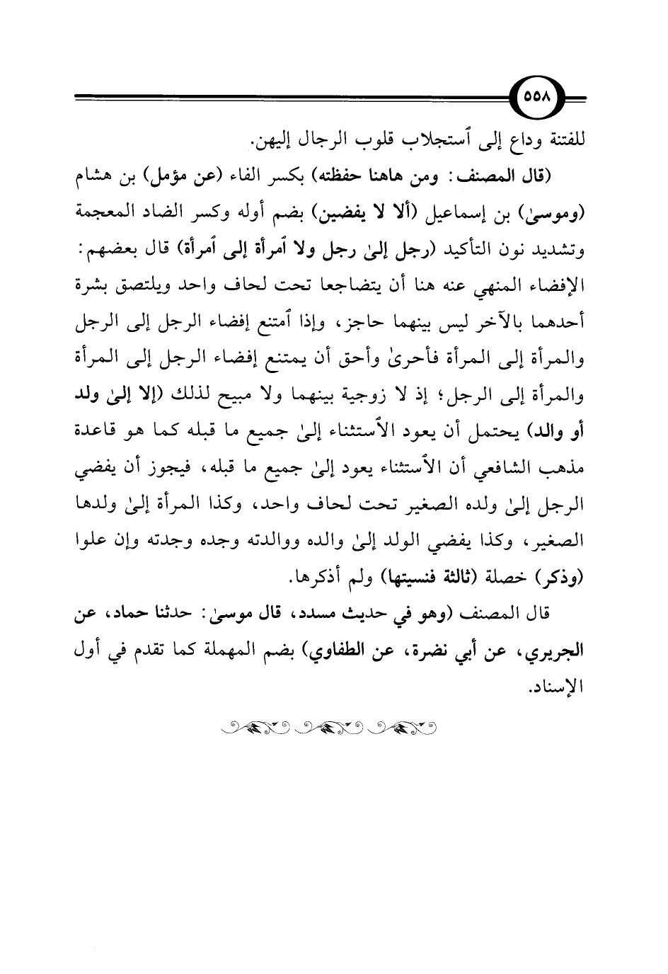(قال المصنف: ومن ها هنا حفظته) بكسر الفاء (عن مؤمل) بن هشام (وموسى) بن إسماعيل (ألا لا يفضين) بضم أوله وكسر الضاد المعجمة وتشديد نون التأكيد (رجل إلى رجل ولا امرأة إلى امرأة) قال بعضهم: الإفضاء المنهي عنه هنا أن يتضاجعا تحت لحاف واحد ويلتصق بشرة أحدهما بالآخر ليس بينهما حاجز، وإذا امتنع إفضاء الرجل إلى الرجل والمرأة إلى المرأة فأحرى وأحق أن يمتنع إفضاء الرجل إلى المرأة والمرأة إلى الرجل؛ إذ لا زوجية بينهما ولا مبيح لذلك (إلا إلى ولد أو والد) يحتمل أن يعود الاستثناء إلى جميع ما قبله كما هو قاعدة مذهب الشافعي أن الاستثناء يعود إلى جميع ما قبله، فيجوز أن يفضي الرجل إلى ولده الصغير تحت لحاف واحد، وكذا المرأة إلى ولدها الصغير، وكذا يفضي الولد إلى والده ووالدته وجده وجدته وإن علوا (وذكر) خصلة (ثالثة فنسيتها) ولم أذكرها.