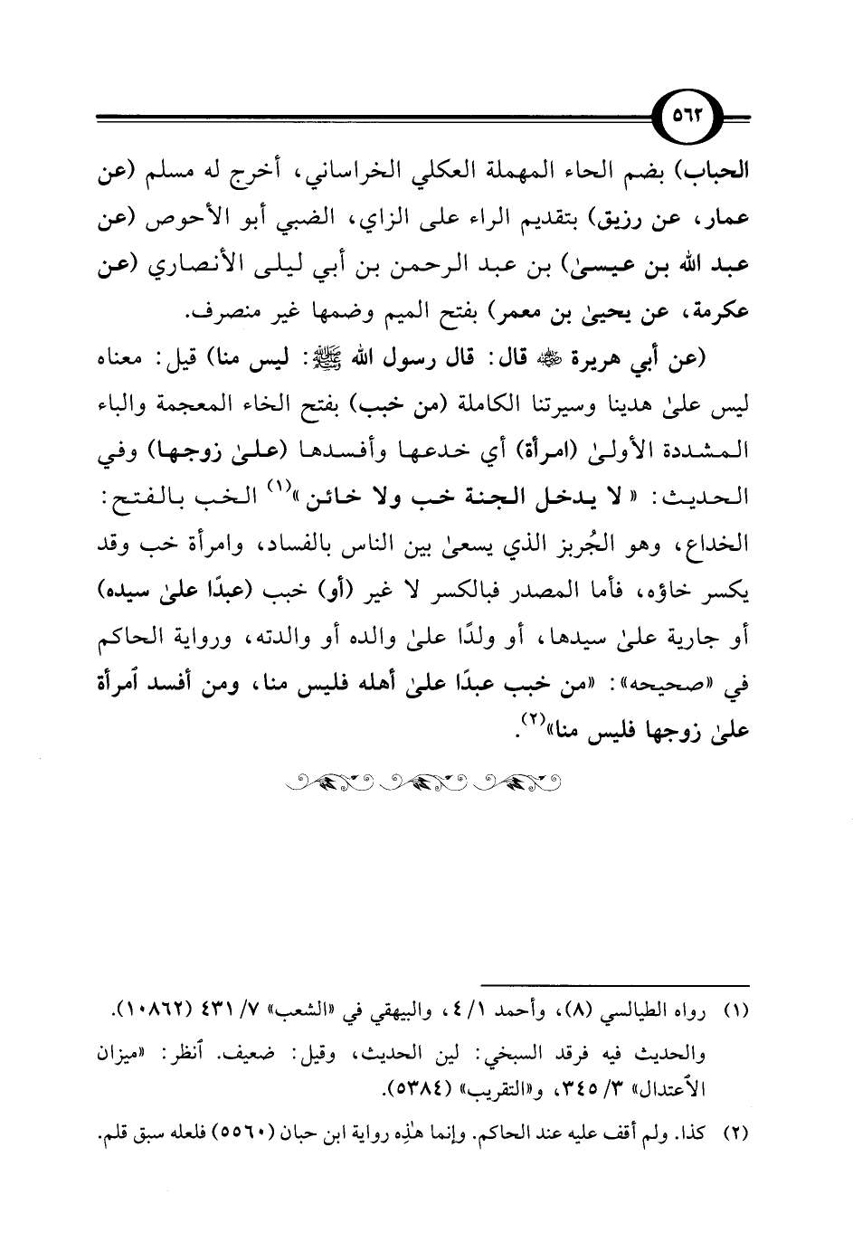 (عن أبي هريرة - رضي الله عنه - قال: قال رسول الله - صلى الله عليه وسلم -: ليس منا) قيل: معناه ليس على هدينا وسيرتنا الكاملة (من خبب) بفتح الخاء المعجمة والباء المشددة الأولى (امرأة) أي خدعها وأفسدها (على زوجها) وفي الحديث: "لا يدخل الجنة خب ولا خائن" (¬1) الخب بالفتح: الخداع، وهو الجُربز الذي يسعى بين الناس بالفساد، وامرأة خب وقد يكسر خاؤه، فأما المصدر فبالكسر لا غير (أو) خبب (عبدًا على سيده) أو جارية على سيدها، أو ولدًا على والده أو والدته، ورواية الحاكم في "صحيحه": "من خبب عبدًا على أهله فليس منا، ومن أفسد امرأة على زوجها فليس منا" (¬2).