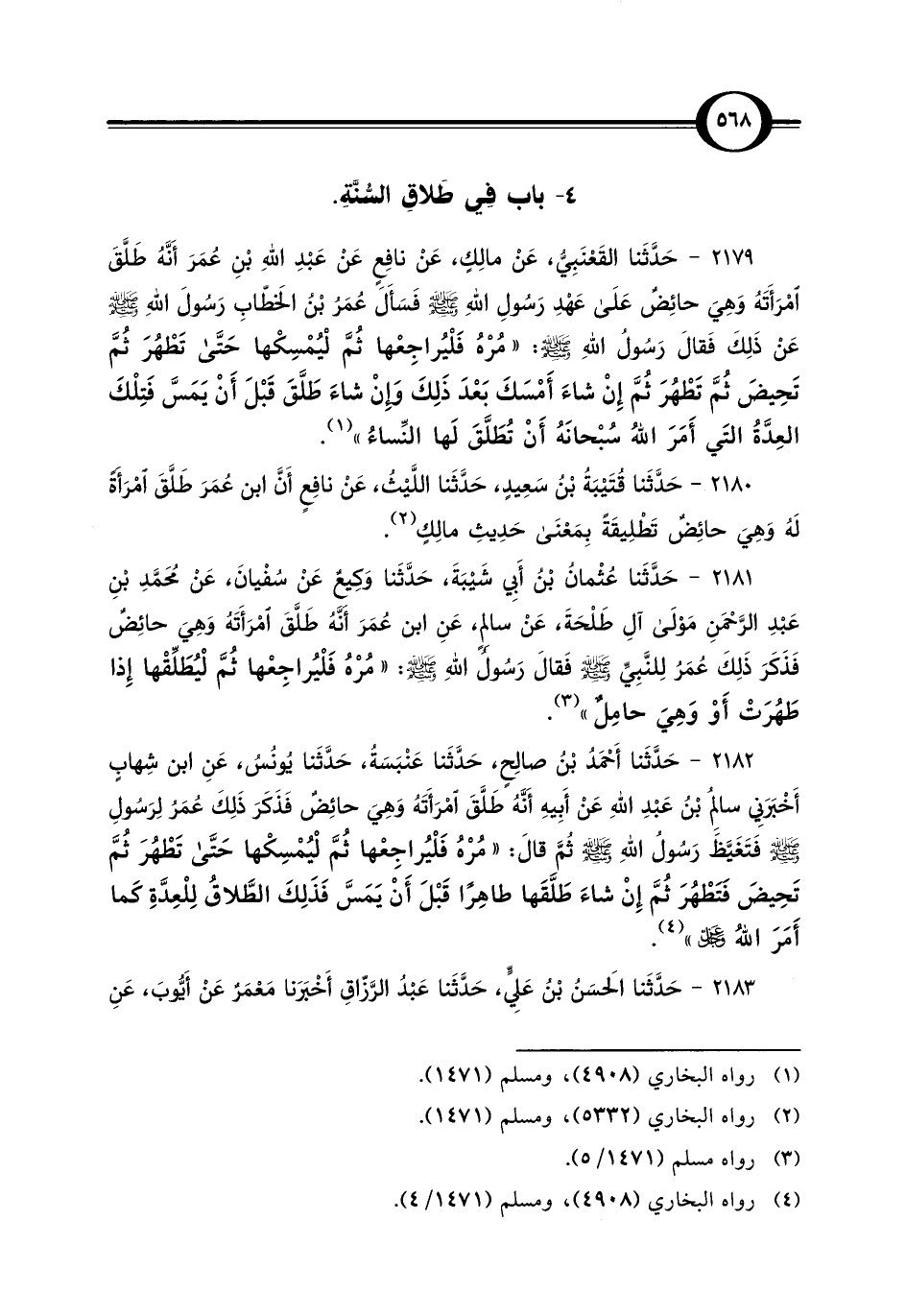 2181 - حَدَّثَنا عُثْمانُ بْنُ أَبِي شَيْبَةَ، حَدَّثَنا وَكِيعٌ عَنْ سُفْيانَ، عَنْ مُحَمَّدِ بْنِ عَبْدِ الرَّحْمَنِ مَوْلَى آلِ طَلْحَةَ، عَنْ سالِمٍ، عَنِ ابن عُمَرَ أَنَّهُ طَلَّقَ امْرَأَتَهُ وَهِيَ حائِضٌ فَذَكَرَ ذَلِكَ عُمَرُ لِلنَّبِيِّ - صلى الله عليه وسلم - فَقَالَ رَسُولُ اللهِ - صلى الله عليه وسلم -: "مُرْهُ فَلْيُراجِعْها ثُمَّ لْيُطَلِّقْها إِذَا طَهُرَتْ أَوْ وَهِيَ حامِلٌ" (¬3).