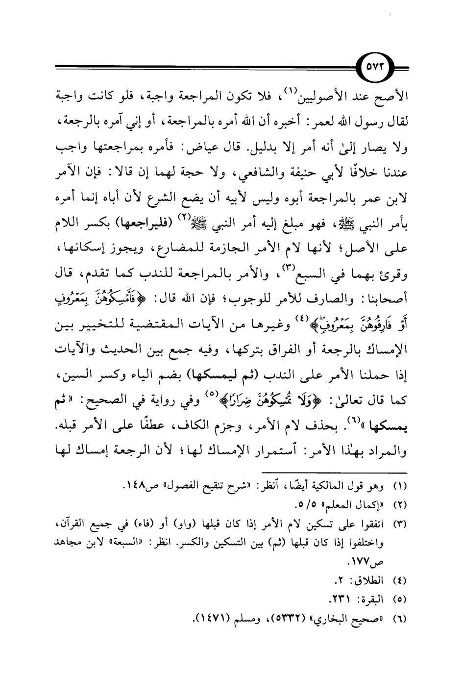 الأصح عند الأصوليين (¬1)، فلا تكون المراجعة واجبة، فلو كانت واجبة لقال رسول الله لعمر: أخبره أن الله أمره بالمراجعة، أو إني آمره بالرجعة، ولا يصار إلى أنه أمر إلا بدليل. قال عياض: فأمره بمراجعتها واجب عندنا خلافًا لأبي حنيفة والشافعي، ولا حجة لهما إن قالا: فإن الآمر لابن عمر بالمراجعة أبوه وليس لأبيه أن يضع الشرع لأن أباه إنما أمره بأمر النبي - صلى الله عليه وسلم -، فهو مبلغ إليه أمر النبي - صلى الله عليه وسلم - (¬2) (فليراجعها) بكسر اللام على الأصل؛ لأنها لام الأمر الجازمة للمضارع، ويجوز إسكانها، وقرئ بهما في السبع (¬3)، والأمر بالمراجعة للندب كما تقدم، قال أصحابنا: والصارف للأمر للوجوب؛ فإن الله قال: {فَأَمْسِكُوهُنَّ بِمَعْرُوفٍ أَوْ فَارِقُوهُنَّ بِمَعْرُوفٍ} (¬4) وغيرها من الآيات المقتضية للتخيير بين الإمساك بالرجعة أو الفراق بتركها، وفيه جمع بين الحديث والآيات إذا حملنا الأمر على الندب (ثم ليمسكها) بضم الياء وكسر السين، كما قال تعالى: {وَلَا تُمْسِكُوهُنَّ ضِرَارًا} (¬5) وفي رواية في الصحيح: "ثم يمسكها" (¬6). بحذف لام الأمر، وجزم الكاف، عطفًا على الأمر قبله. والمراد بهذا الأمر: استمرار الإمساك لها؛ لأن الرجعة إمساك لها