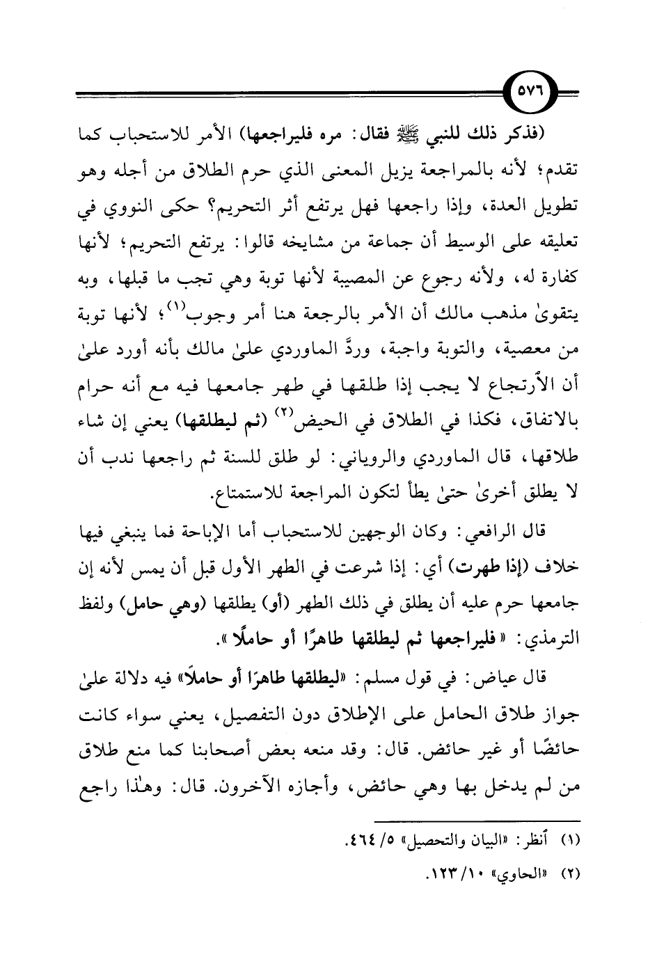 (فذكر ذلك للنبي - صلى الله عليه وسلم - فقال: مره فليراجعها) الأمر للاستحباب كما تقدم؛ لأنه بالمراجعة يزيل المعنى الذي حرم الطلاق من أجله وهو تطويل العدة، وإذا راجعها فهل يرتفع أثر التحريم؟ حكى النووي في تعليقه على الوسيط أن جماعة من مشايخه قالوا: يرتفع التحريم؛ لأنها كفارة له، ولأنه رجوع عن المصيبة لأنها توبة وهي تجب ما قبلها، وبه يتقوى مذهب مالك أن الأمر بالرجعة هنا أمر وجوب (¬1)؛ لأنها توبة من معصية، والتوبة واجبة، وردَّ الماوردي على مالك بأنه أورد على أن الارتجاع لا يجب إذا طلقها في طهر جامعها فيه مع أنه حرام بالاتفاق، فكذا في الطلاق في الحيض (¬2) (ثم ليطلقها) يعني إن شاء طلاقها، قال الماوردي والروياني: لو طلق للسنة ثم راجعها ندب أن لا يطلق أخرى حتى يطأ لتكون المراجعة للاستمتاع.