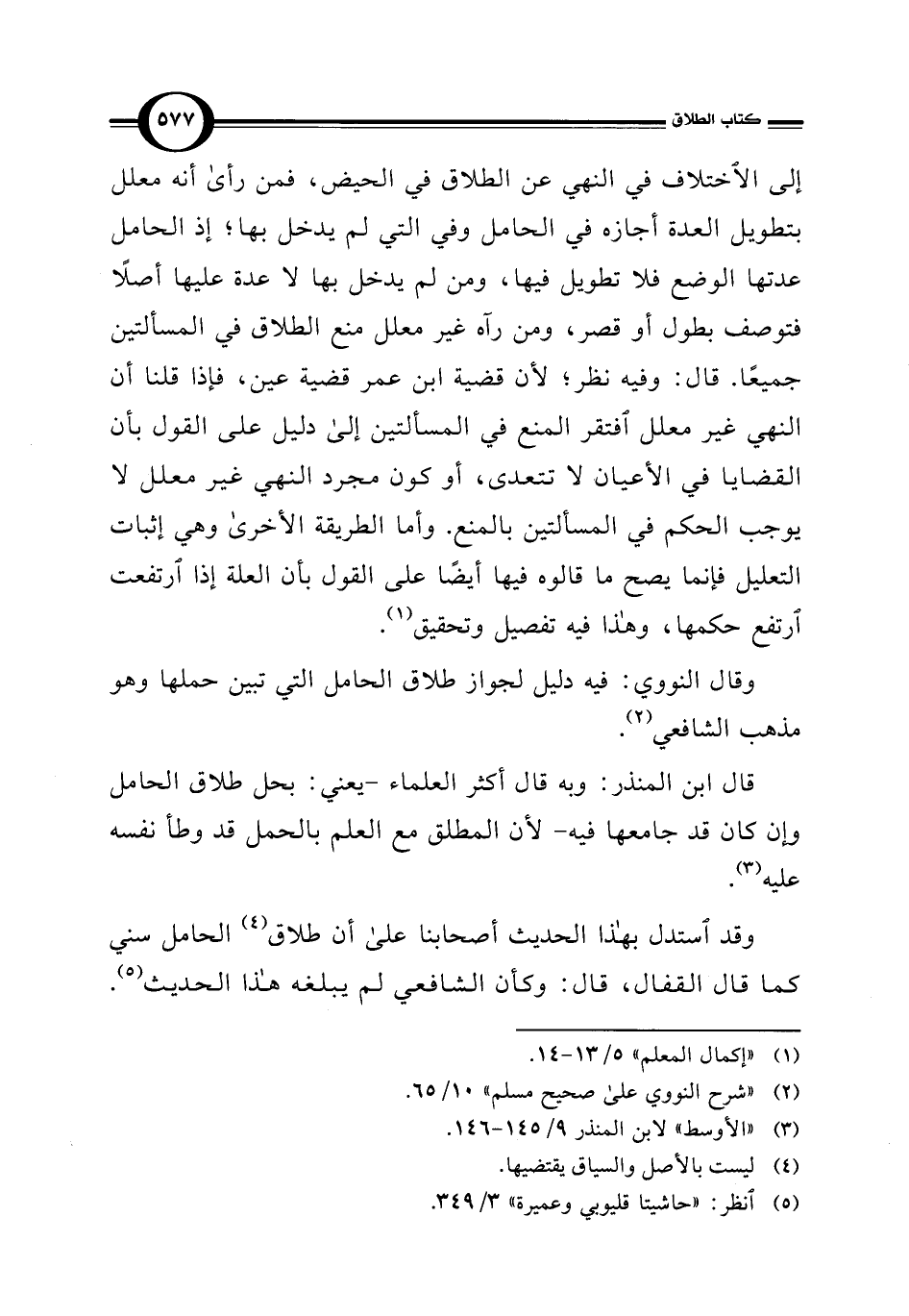 إلى الاختلاف في النهي عن الطلاق في الحيض، فمن رأى أنه معلل بتطويل العدة أجازه في الحامل وفي التي لم يدخل بها؛ إذ الحامل عدتها الوضع فلا تطويل فيها، ومن لم يدخل بها لا عدة عليها أصلًا فتوصف بطول أو قصر، ومن رآه غير معلل منع الطلاق في المسألتين جميعًا. قال: وفيه نظر؛ لأن قضية ابن عمر قضية عين، فإذا قلنا أن النهي غير معلل افتقر المنع في المسألتين إلى دليل على القول بأن القضايا في الأعيان لا تتعدى، أو كون مجرد النهي غير معلل لا يوجب الحكم في المسألتين بالمنع. وأما الطريقة الأخرى وهي إثبات التعليل فإنما يصح ما قالوه فيها أيضًا على القول بأن العلة إذا ارتفعت ارتفع حكمها، وهذا فيه تفصيل وتحقيق (¬1).