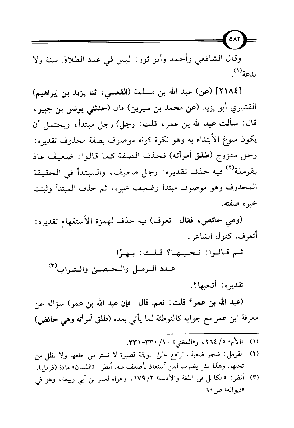 [2184] (عن) عبد الله بن مسلمة (القعنبي، ثنا يزيد بن إبراهيم) القشيري أبو يزيد (عن محمد بن سيرين) قال (حدثني يونس بن جبير، قال: سألت عبد الله بن عمر، قلت: رجل) رجل مبتدأ، ويحتمل أن يكون سوغ الابتداء به وهو نكرة كونه موصوف بصفة محذوف تقديره: رجل متزوج (طلق امرأته) فحذف الصفة كما قالوا: ضعيف عاذ بقرملة (¬2) فيه حذف تقديره: رجل ضعيف، والمبتدأ في الحقيقة المحذوف وهو موصوف مبتدأ وضعيف خبره، ثم حذف المبتدأ وثبتت خبره صفته.