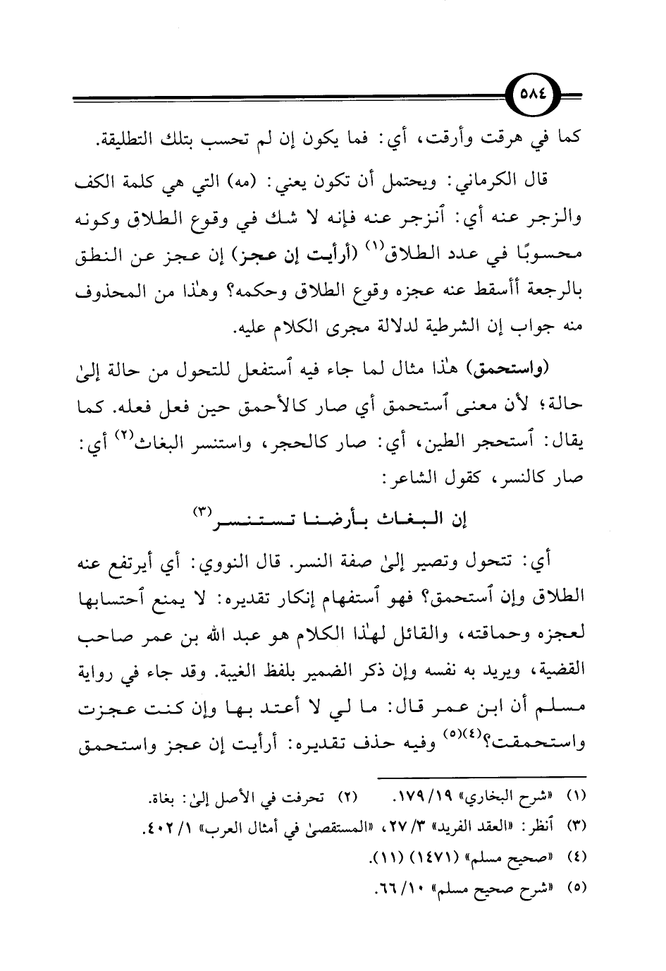 أي: تتحول وتصير إلى صفة النسر. قال النووي: أي أيرتفع عنه الطلاق وإن استحمق؟ فهو استفهام إنكار تقديره: لا يمنع احتسابها لعجزه وحماقته، والقائل لهذا الكلام هو عبد الله بن عمر صاحب القضية، ويريد به نفسه وإن ذكر الضمير بلفظ الغيبة. وقد جاء في رواية مسلم أن ابن عمر قال: ما لي لا أعتد بها وإن كنت عجزت واستحمقت؟ (¬4) (¬5) وفيه حذف تقديره: أرأيت إن عجز واستحمق