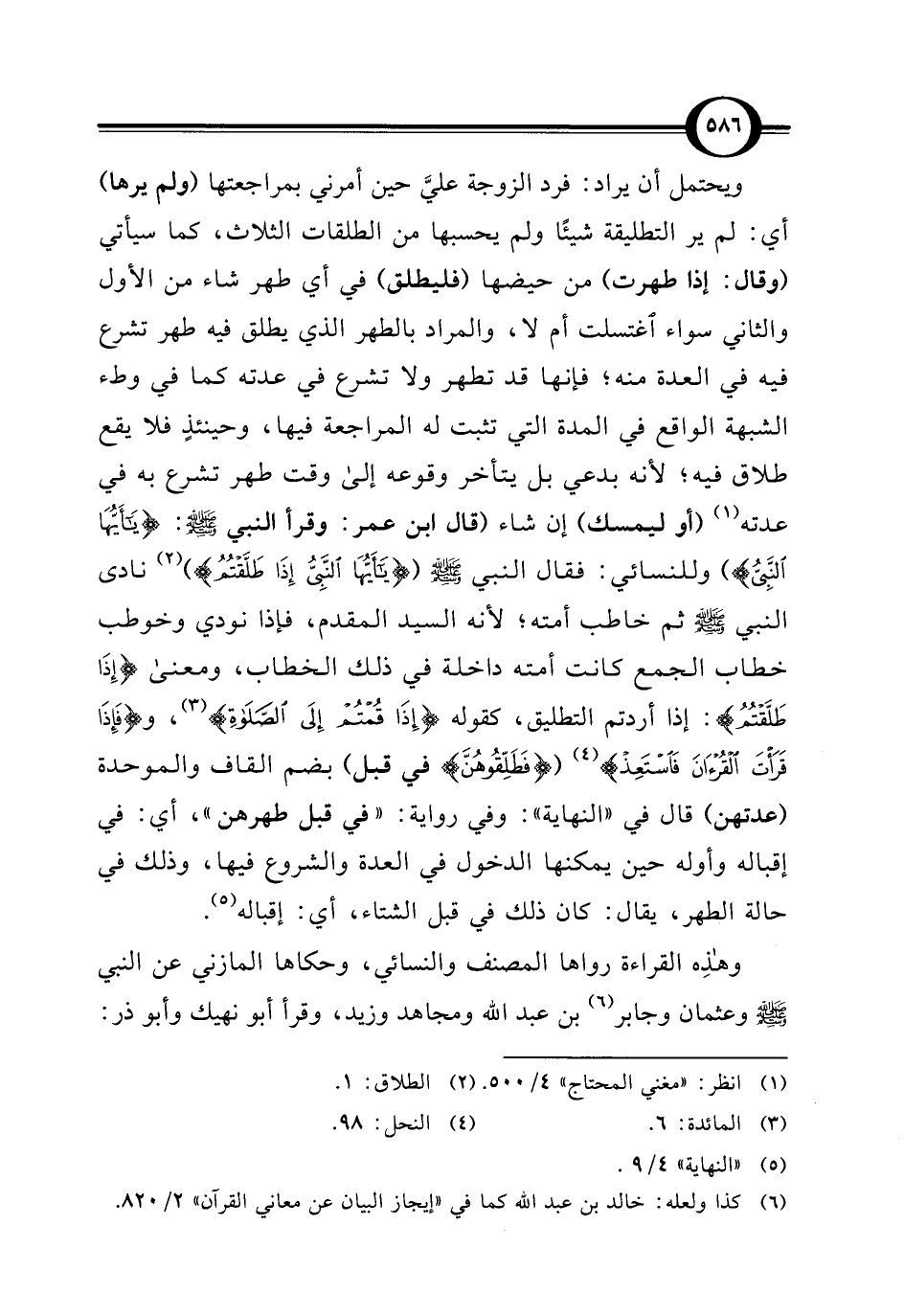 ويحتمل أن يراد: فرد الزوجة عليَّ حين أمرني بمراجعتها (ولم يرها) أي: لم ير التطليقة شيئًا ولم يحسبها من الطلقات الثلاث، كما سيأتي (وقال: إذا طهرت) من حيضها (فليطلق) في أي طهر شاء من الأول والثاني سواء اغتسلت أم لا، والمراد بالطهر الذي يطلق فيه طهر تشرع فيه في العدة منه؛ فإنها قد تطهر ولا تشرع في عدته كما في وطء الشبهة الواقع في المدة التي تثبت له المراجعة فيها، وحينئذٍ فلا يقع طلاق فيه؛ لأنه بدعي بل يتأخر وقوعه إلى وقت طهر تشرع به في عدته (¬1) (أو ليمسك) إن شاء (قال ابن عمر: وقرأ النبي - صلى الله عليه وسلم -: {يَاأَيُّهَا النَّبِيُّ}) وللنسائي: فقال النبي - صلى الله عليه وسلم - ({يَاأَيُّهَا النَّبِيُّ إِذَا طَلَّقْتُمُ}) (¬2) نادى النبي - صلى الله عليه وسلم - ثم خاطب أمته؛ لأنه السيد المقدم، فإذا نودي وخوطب خطاب الجمع كانت أمته داخلة في ذلك الخطاب، ومعنى {إِذَا طَلَّقْتُمُ}: إذا أردتم التطليق، كقوله {إِذَا قُمْتُمْ إِلَى الصَّلَاةِ} (¬3)، {فَإِذَا قَرَأْتَ الْقُرْآنَ فَاسْتَعِذْ} (¬4) ({فَطَلِّقُوهُنَّ} في قبل) بضم القاف والموحدة (عدتهن) قال في "النهاية": وفي رواية: "في قبل طهرهن"، أي: في إقباله وأوله حين يمكنها الدخول في العدة والشروع فيها، وذلك في حالة الطهر، يقال: كان ذلك في قبل الشتاء، أي: إقباله (¬5).