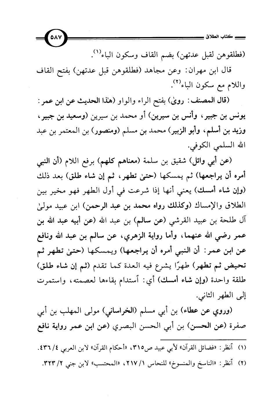 (عن أبي وائل) شقيق بن سلمة (معناهم كلهم) برفع اللام (أن النبي أمره أن يراجعها) ثم يمسكها (حتى تطهر، ثم إن شاء طلق) بعد ذلك (وإن شاء أمسك) يعني أنها إذا شرعت في أول الطهر فهو مخير بين الطلاق والإمساك (وكذلك رواه محمد بن عبد الرحمن) ابن عبيد مولى آل طلحة بن عبيد القرشي (عن سالم) بن عبد الله (عن أبيه عبد الله بن عمر رضي الله عنهما، وأما رواية الزهري، عن سالم بن عبد الله ونافع عن ابن عمر: أن النبي أمره أن يراجعها) ويمسكها (حتى تطهر ثم تحيض ثم تطهر) طهرًا يشرع فيه العدة كما تقدم (ثم إن شاء طلق) طلقة واحدة (وإن شاء أمسك) أي: استدام بقاءها لعصمته، واستمرت إلى الطهر الثاني.