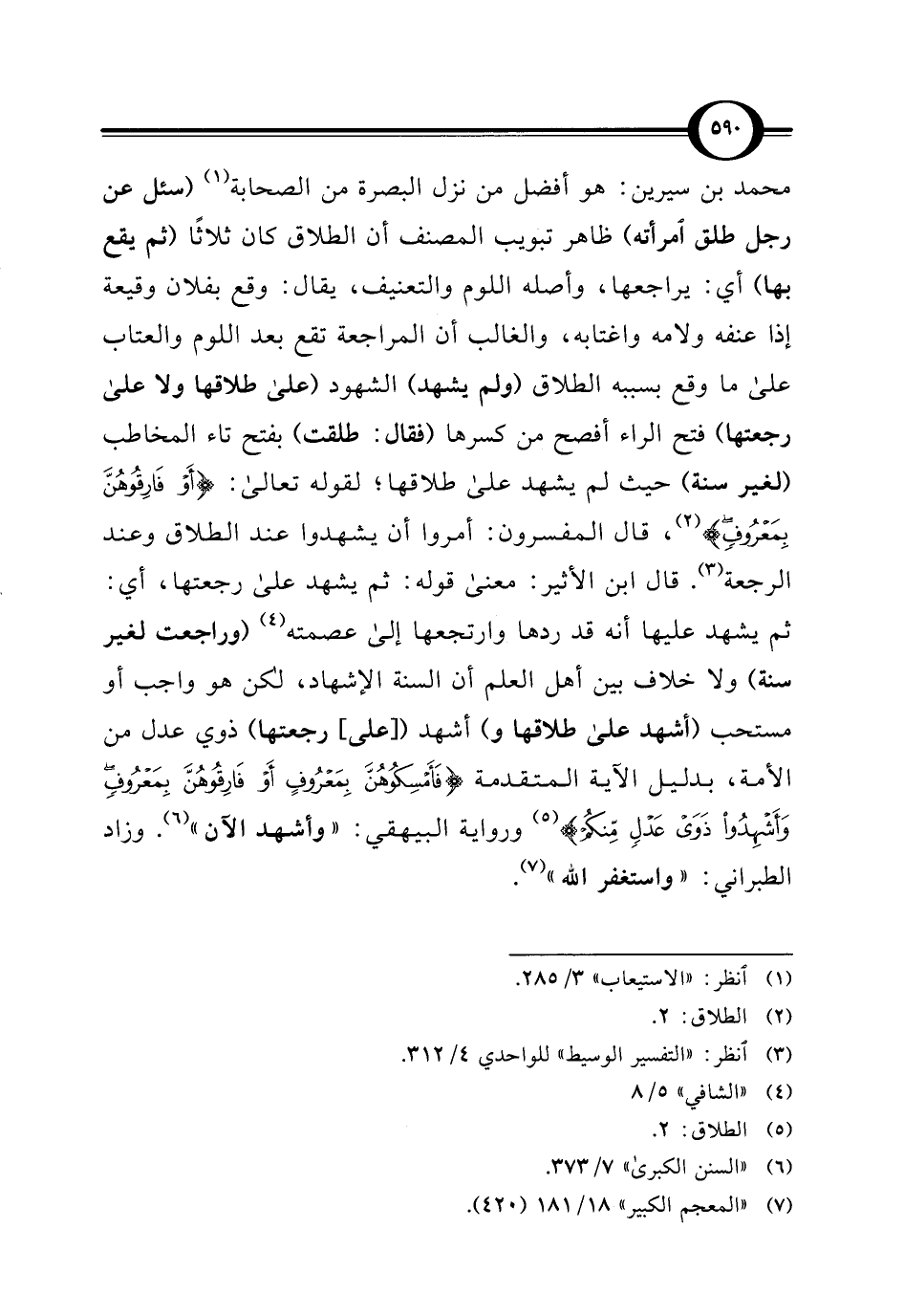 محمد بن سيرين: هو أفضل من نزل البصرة من الصحابة (¬1) (سئل عن رجل طلق امرأته) ظاهر تبويب المصنف أن الطلاق كان ثلاثًا (ثم يقع بها) أي: يراجعها، وأصله اللوم والتعنيف، يقال: وقع بفلان وقيعة إذا عنفه ولامه واغتابه، والغالب أن المراجعة تقع بعد اللوم والعتاب على ما وقع بسببه الطلاق (ولم يشهد) الشهود (على طلاقها ولا على رجعتها) فتح الراء أفصح من كسرها (فقال: طلقت) بفتح تاء المخاطب (لغير سنة) حيث لم يشهد على طلاقها؛ لقوله تعالى: {أَوْ فَارِقُوهُنَّ بِمَعْرُوفٍ} (¬2)، قال المفسرون: أمروا أن يشهدوا عند الطلاق وعند الرجعة (¬3). قال ابن الأثير: معنى قوله: ثم يشهد على رجعتها، أي: ثم يشهد عليها أنه قد ردها وارتجعها إلى عصمته (¬4) (وراجعت لغير سنة) ولا خلاف بين أهل العلم أن السنة الإشهاد، لكن هو واجب أو مستحب (أشهد على طلاقها و) أشهد ([على] رجعتها) ذوي عدل من الأمة، بدليل الآية المتقدمة {فَأَمْسِكُوهُنَّ بِمَعْرُوفٍ أَوْ فَارِقُوهُنَّ بِمَعْرُوفٍ وَأَشْهِدُوا ذَوَيْ عَدْلٍ مِنْكُمْ} (¬5) ورواية البيهقي: "وأشهد الآن" (¬6). وزاد الطبراني: "واستغفر الله" (¬7).