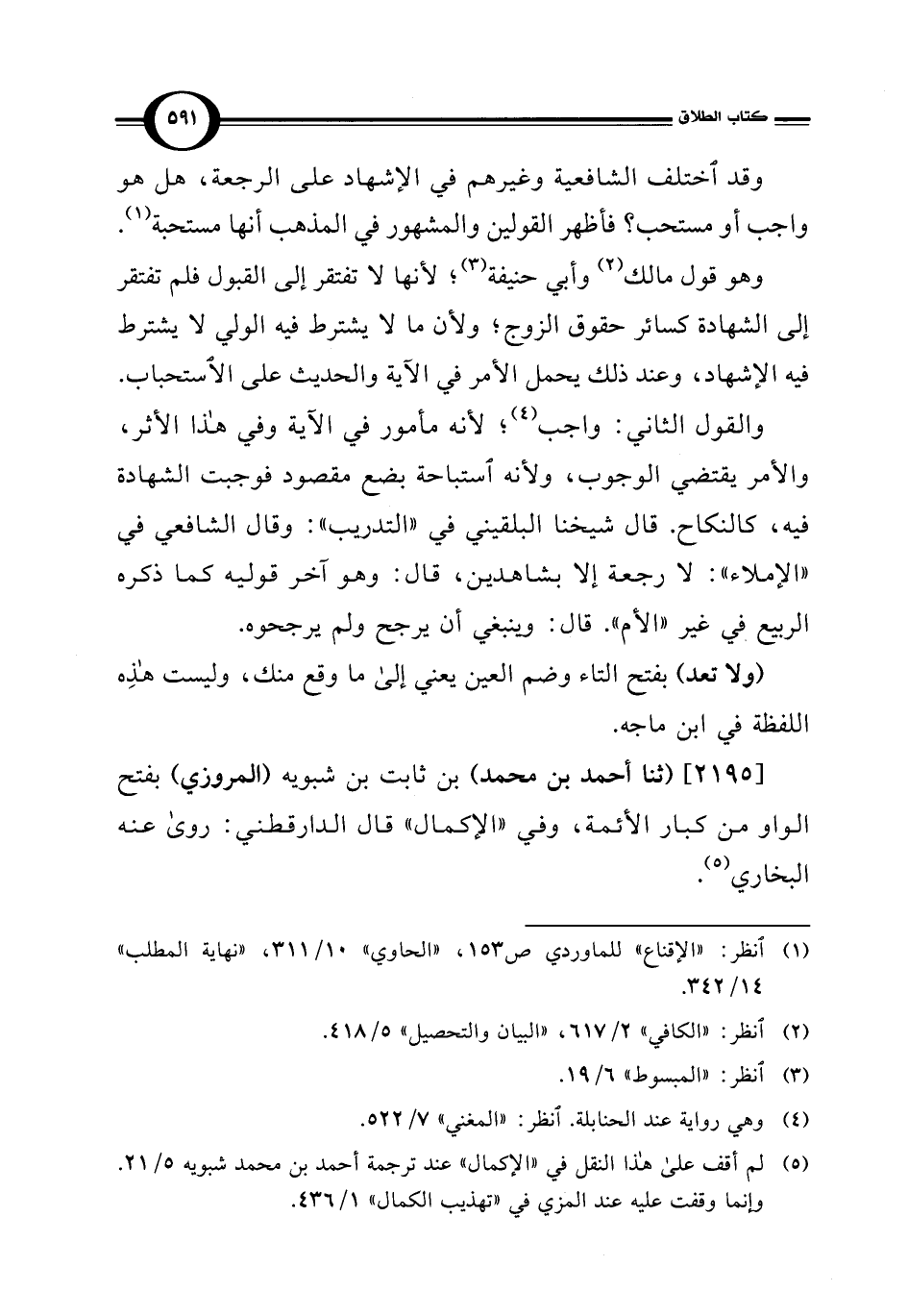 وقد اختلف الشافعية وغيرهم في الإشهاد على الرجعة، هل هو واجب أو مستحب؟ فأظهر القولين والمشهور في المذهب أنها مستحبة (¬1).