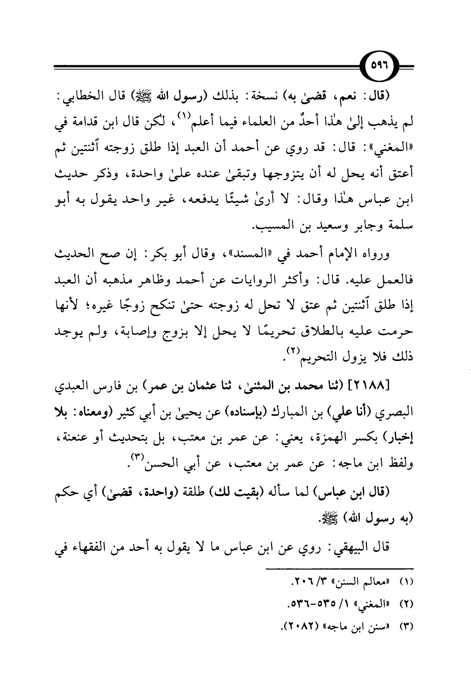 (قال: نعم، قضى به) نسخة: بذلك (رسول الله - صلى الله عليه وسلم -) قال الخطابي: لم يذهب إلى هذا أحدٌ من العلماء فيما أعلم (¬1)، لكن قال ابن قدامة في "المغني": قال: قد روي عن أحمد أن العبد إذا طلق زوجته اثنتين ثم أعتق أنه يحل له أن يتزوجها وتبقى عنده على واحدة، وذكر حديث ابن عباس هذا وقال: لا أرى شيئًا يدفعه، غير واحد يقول به أبو سلمة وجابر وسعيد بن المسيب.
