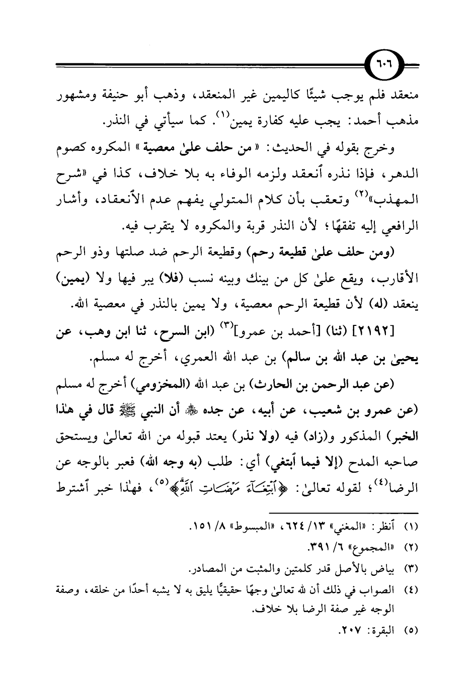 (عن عبد الرحمن بن الحارث) بن عبد الله (المخزومي) أخرج له مسلم (عن عمرو بن شعيب، عن أبيه، عن جده - رضي الله عنهم - أن النبي - صلى الله عليه وسلم - قال في هذا الخبر) المذكور و (زاد) فيه (ولا نذر) يعتد قبوله من الله تعالى ويستحق صاحبه المدح (إلا فيما ابتغي) أي: طلب (به وجه الله) فعبر بالوجه عن الرضا (¬4)؛ لقوله تعالى: {ابْتِغَاءَ مَرْضَاتِ اللَّهِ} (¬5)، فهذا خبر اشترط