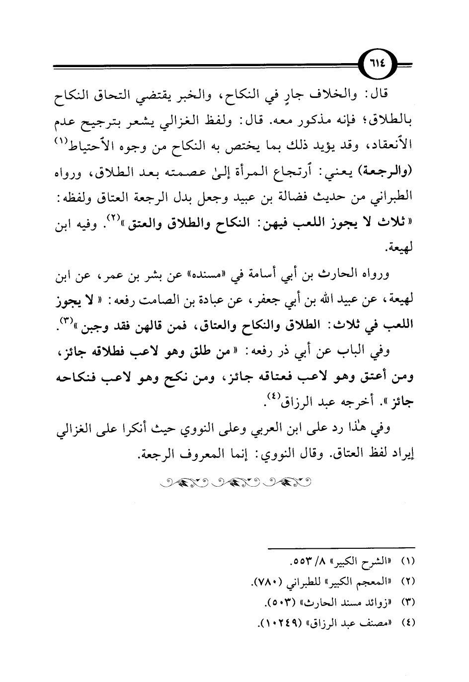 وفي هذا رد على ابن العربي وعلى النووي حيث أنكرا على الغزالي إيراد لفظ العتاق. وقال النووي: إنما المعروف الرجعة.