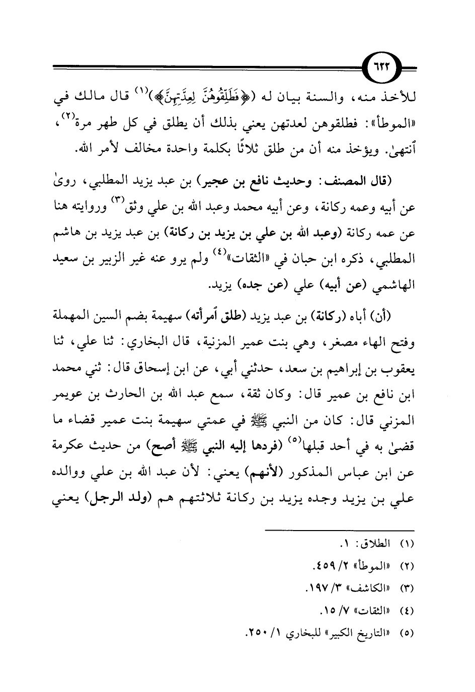 (أن) أباه (ركانة) بن عبد يزيد (طلق امرأته) سهيمة بضم السين المهملة وفتح الهاء مصغر، وهي بنت عمير المزنية، قال البخاري: ثنا علي، ثنا يعقوب بن إبراهيم بن سعد، حدثني أبي، عن ابن إسحاق قال: ثني محمد بن نافع بن عمير قال: وكان ثقة، سمع عبد الله بن الحارث بن عويمر المزني قال: كان من النبي - صلى الله عليه وسلم - في عمتي سهيمة بنت عمير قضاء ما قضى به في أحد قبلها (¬5) (فردها إليه النبي - صلى الله عليه وسلم - أصح) من حديث عكرمة عن ابن عباس المذكور (لأنهم) يعني: لأن عبد الله بن علي ووالده علي بن يزيد وجده يزيد بن ركانة ثلاثتهم هم (ولد الرجل) يعني