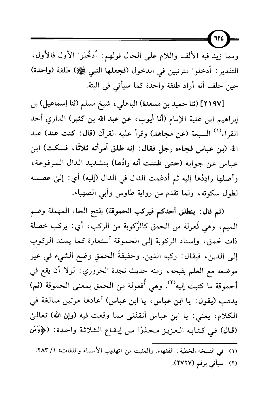 [2197] (ثنا حميد بن مسعدة) الباهلي، شيخ مسلم (ثنا إسماعيل) بن إبراهيم ابن علية الإمام (أنا أيوب، عن عبد الله بن كثير) الداري أحد القراء (¬1) السبعة (عن مجاهد) وقرأ عليه القرآن (قال: كنت عند) عبد الله (بن عباس فجاءه رجل فقال: إنه طلق امرأته ثلاثًا، فسكت) ابن عباس عن جوابه (حتى ظننت أنه رادُّها) بتشديد الدال المرفوعة، وأصلها رادِدُها إليه ثم أدغمت الدال في الدال (إليه) أي: إلى عصمته لطول سكوته، ولما تقدم من رواية طاوس وأبي الصهباء.