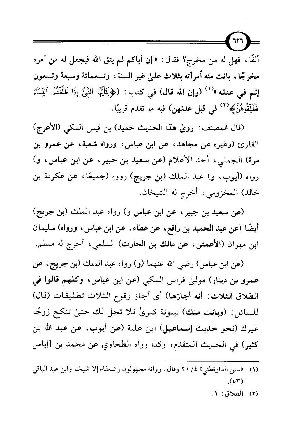 (قال المصنف: روى هذا الحديث حميد) بن قيس المكي (الأعرج) القارئ (وغيره عن مجاهد، عن ابن عباس، ورواه شعبة، عن عمرو بن مرة) الجملي، أحد الأعلام (عن سعيد بن جبير، عن ابن عباس، و) رواه (أيوب، و) عبد الملك (بن جريج) رووه (جميعًا، عن عكرمة بن خالد) المخزومي، أخرج له الشيخان.