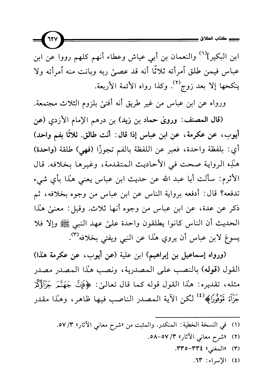 (قال المصنف: وروى حماد بن زيد) بن درهم الإمام الأزدي (عن أيوب، عن عكرمة، عن ابن عباس إذا قال: أنت طالق. ثلاثًا بفم واحد) أي: بلفظة واحدة، فعبر عن اللفظة بالفم تجوزًا (فهي) طلقة (واحدة) هذِه الرواية صحت في الأحاديث المتقدمة، وغيرها بخلافه. قال الأثرم: سألت أبا عبد الله عن حديث ابن عباس يعني هذا بأي شيء تدفعه؟ قال: أدفعه برواية الناس عن ابن عباس من وجوه بخلافه، ثم ذكر عن عدة، عن ابن عباس من وجوه أنها ثلاث. وقيل: معنى هذا الحديث أن الناس كانوا يطلقون واحدة على عهد النبي - صلى الله عليه وسلم - وإلا فلا يسوغ لابن عباس أن يروي هذا عن النبي ويفتي بخلافه (¬3).