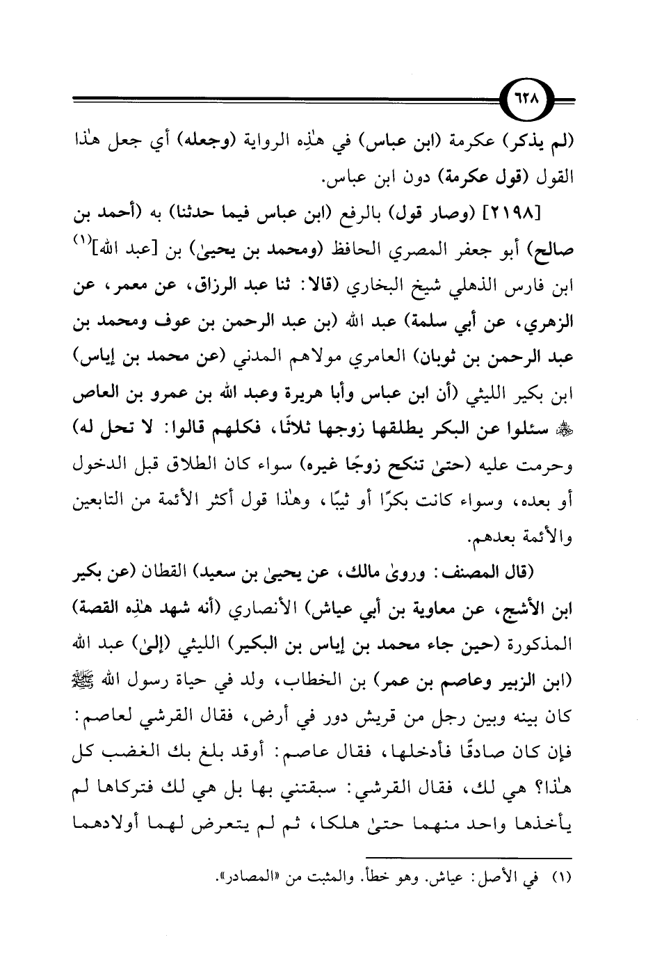 [2198] (وصار قول) بالرفع (ابن عباس فيما حدثنا) به (أحمد بن صالح) أبو جعفر المصري الحافظ (ومحمد بن يحيى) بن [عبد الله] (¬1) ابن فارس الذهلي شيخ البخاري (قالا: ثنا عبد الرزاق، عن معمر، عن الزهري، عن أبي سلمة) عبد الله (بن عبد الرحمن بن عوف ومحمد بن عبد الرحمن بن ثوبان) العامري مولاهم المدني (عن محمد بن إياس) ابن بكير الليثي (أن ابن عباس وأبا هريرة وعبد الله بن عمرو بن العاص - رضي الله عنهم - سئلوا عن البكر يطلقها زوجها ثلاثًا، فكلهم قالوا: لا تحل له) وحرمت عليه (حتى تنكح زوجًا غيره) سواء كان الطلاق قبل الدخول أو بعده، وسواء كانت بكرًا أو ثيبًا، وهذا قول أكثر الأئمة من التابعين والأئمة بعدهم.
