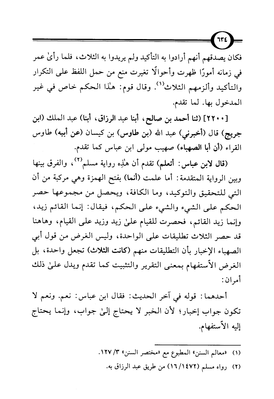 (قال لابن عباس: أتعلم) تقدم أن هذِه رواية مسلم (¬2)، والفرق بينها وبين الرواية المتقدمة: أما علمت (أنما) بفتح الهمزة وهي مركبة من أن التي للتحقيق والتوكيد، وما الكافة، ويحصل من مجموعها حصر الحكم على الشيء والشيء على الحكم، فيقال: إنما القائم زيد، وإنما زيد القائم، فحصرت للقيام على زيد وزيد على القيام، وها هنا قد حصر الثلاث تطليقات على الواحدة، وليس الغرض من قول أبي الصهباء الإخبار بأن التطليقات منهم (كانت الثلاث) تجعل واحدة، بل الغرض الاستفهام بمعنى التقرير والتثبيت كما تقدم ويدل على ذلك أمران: