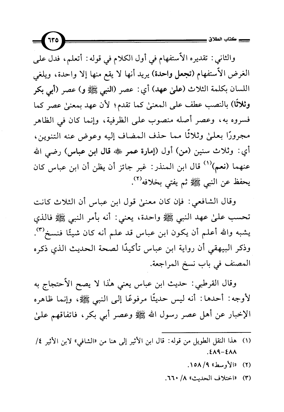 وقال القرطبي: حديث ابن عباس يعني هذا لا يصح الاحتجاج به لأوجه: أحدها: أنه ليس حديثًا مرفوعًا إلى النبي - صلى الله عليه وسلم -، وإنما ظاهره الإخبار عن أهل عصر رسول الله - صلى الله عليه وسلم - وعصر أبي بكر، فاتفاقهم على
