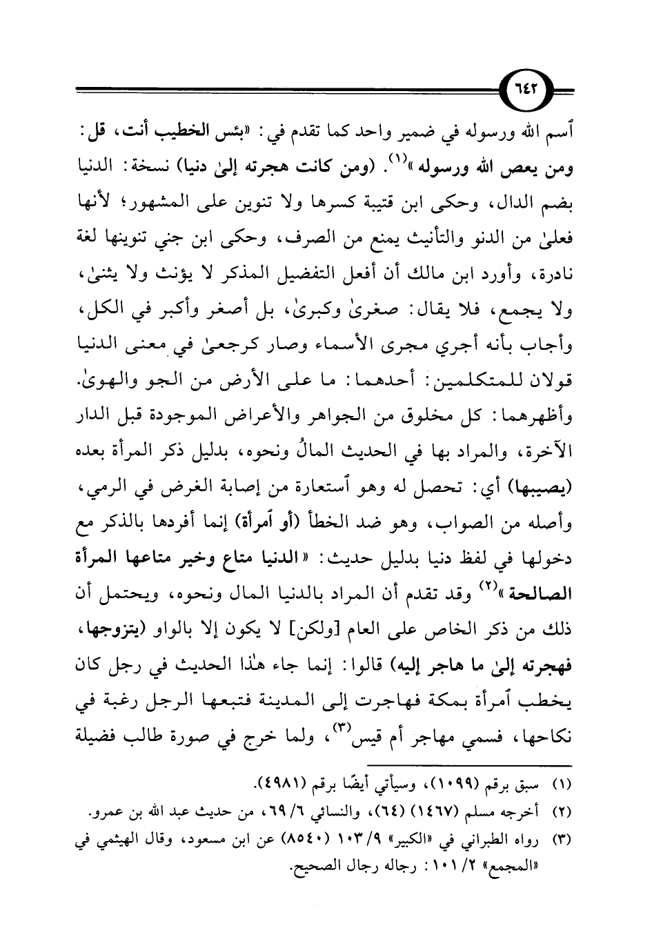 اسم الله ورسوله في ضمير واحد كما تقدم في: "بئس الخطيب أنت، قل: ومن يعص الله ورسوله" (¬1). (ومن كانت هجرته إلى دنيا) نسخة: الدنيا بضم الدال، وحكى ابن قتيبة كسرها ولا تنوين على المشهور؛ لأنها فعلى من الدنو والتأنيث يمنع من الصرف، وحكى ابن جني تنوينها لغة نادرة، وأورد ابن مالك أن أفعل التفضيل المذكر لا يؤنث ولا يثنى، ولا يجمع، فلا يقال: صغرى وكبرى، بل أصغر وأكبر في الكل، وأجاب بأنه أجري مجرى الأسماء وصار كرجعى في معنى الدنيا قولان للمتكلمين: أحدهما: ما على الأرض من الجو والهوى. وأظهرهما: كل مخلوق من الجواهر والأعراض الموجودة قبل الدار الآخرة، والمراد بها في الحديث المالُ ونحوه، بدليل ذكر المرأة بعده (يصيبها) أي: تحصل له وهو استعارة من إصابة الغرض في الرمي، وأصله من الصواب، وهو ضد الخطأ (أو امرأة) إنما أفردها بالذكر مع دخولها في لفظ دنيا بدليل حديث: "الدنيا متاع وخير متاعها المرأة الصالحة" (¬2) وقد تقدم أن المراد بالدنيا المال ونحوه، ويحتمل أن ذلك من ذكر الخاص على العام [ولكن] لا يكون إلا بالواو (يتزوجها، فهجرته إلى ما هاجر إليه) قالوا: إنما جاء هذا الحديث في رجل كان يخطب امرأة بمكة فهاجرت إلى المدينة فتبعها الرجل رغبة في نكاحها، فسمي مهاجر أم قيس (¬3)، ولما خرج في صورة طالب فضيلة