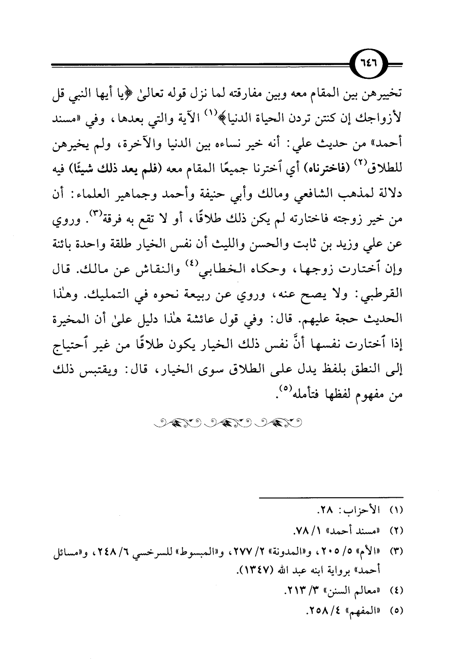 تخييرهن بين المقام معه وبين مفارقته لما نزل قوله تعالى {يَاأَيُّهَا النَّبِيُّ قُلْ لِأَزْوَاجِكَ إِنْ كُنْتُنَّ تُرِدْنَ الْحَيَاةَ الدُّنْيَا} (¬1) الآية والتي بعدها، وفي "مسند أحمد" من حديث علي: أنه خير نساءه بين الدنيا والآخرة، ولم يخيرهن للطلاق (¬2) (فاخترناه) أي اخترنا جميعًا المقام معه (فلم يعد ذلك شيئًا) فيه دلالة لمذهب الشافعي ومالك وأبي حنيفة وأحمد وجماهير العلماء: أن من خير زوجته فاختارته لم يكن ذلك طلاقًا، أو لا تقع به فرقة (¬3). وروي عن علي وزيد بن ثابت والحسن والليث أن نفس الخيار طلقة واحدة بائنة وإن اختارت زوجها، وحكاه الخطابي (¬4) والنقاش عن مالك. قال القرطبي: ولا يصح عنه، وروي عن ربيعة نحوه في التمليك. وهذا الحديث حجة عليهم. قال: وفي قول عائشة هذا دليل على أن المخيرة إذا اختارت نفسها أنَّ نفس ذلك الخيار يكون طلاقًا من غير احتياج إلى النطق بلفظ يدل على الطلاق سوى الخيار، قال: ويقتبس ذلك من مفهوم لفظها فتأمله (¬5).