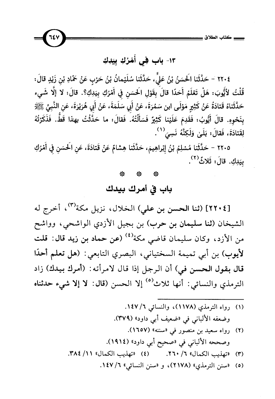 [2204] (ثنا الحسن بن علي) الخلال، نزيل مكة (¬3)، أخرج له الشيخان (ثنا سليمان بن حرب) بن بجيل الأزدي الواشحي، وواشح من الأزد، وكان سليمان قاضي مكة (¬4) (عن حماد بن زيد قال: قلت لأيوب) بن أبي تميمة السختياني، البصري التابعي: (هل تعلم أحدًا قال بقول الحسن في) أن الرجل إذا قال لامرأته: (أمرك بيدك) زاد الترمذي والنسائي: أنها ثلاث (¬5) إلا الحسن (قال: لا إلا شيء حدثناه