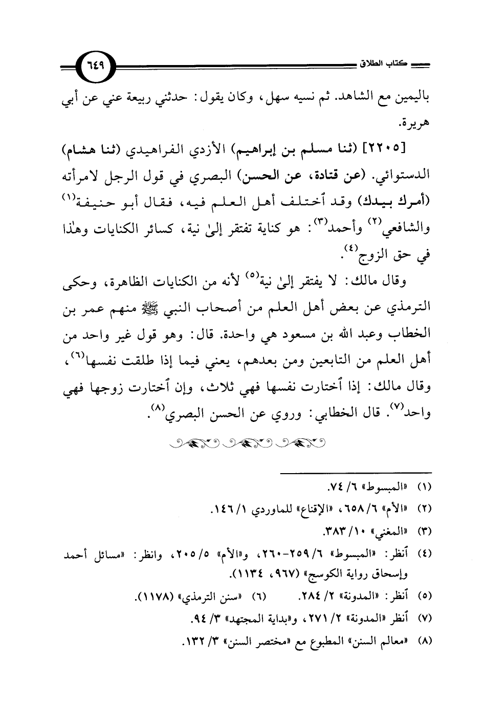 [2205] (ثنا مسلم بن إبراهيم) الأزدي الفراهيدي (ثنا هشام) الدستوائي. (عن قتادة، عن الحسن) البصري في قول الرجل لامرأته (أمرك بيدك) وقد اختلف أهل العلم فيه، فقال أبو حنيفة (¬1) والشافعي (¬2) وأحمد (¬3): هو كناية تفتقر إلى نية، كسائر الكنايات وهذا في حق الزوج (¬4).