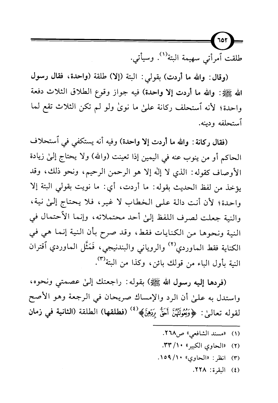 (فقال ركانة: والله ما أردت إلا واحدة) وفيه أنه يستكفي في استحلاف الحاكم أو من ينوب عنه في اليمين إذا تعينت (والله) ولا يحتاج إلى زيادة الأوصاف كقوله: الذي لا إله إلا هو الرحمن الرحيم، ونحو ذلك، وقد يؤخذ من لفظ الحديث بقوله: ما أردت، أي: ما نويت بقولي البتة إلا واحدة؛ لأن أنت دالة على الخطاب لا غير، فلا يحتاج إلى نية، والنية جعلت لصرف اللفظ إلى أحد محتملاته، وإنما الاحتمال في النية ونحوها من الكنايات فقط، وقد صرح بأن النية إنما هي في الكناية فقط الماوردي (¬2) والروياني والبندنيجي، فَمَثَّل الماوردي اقتران النية بأول الباء من قولك بائن، وكذا من البتة (¬3).