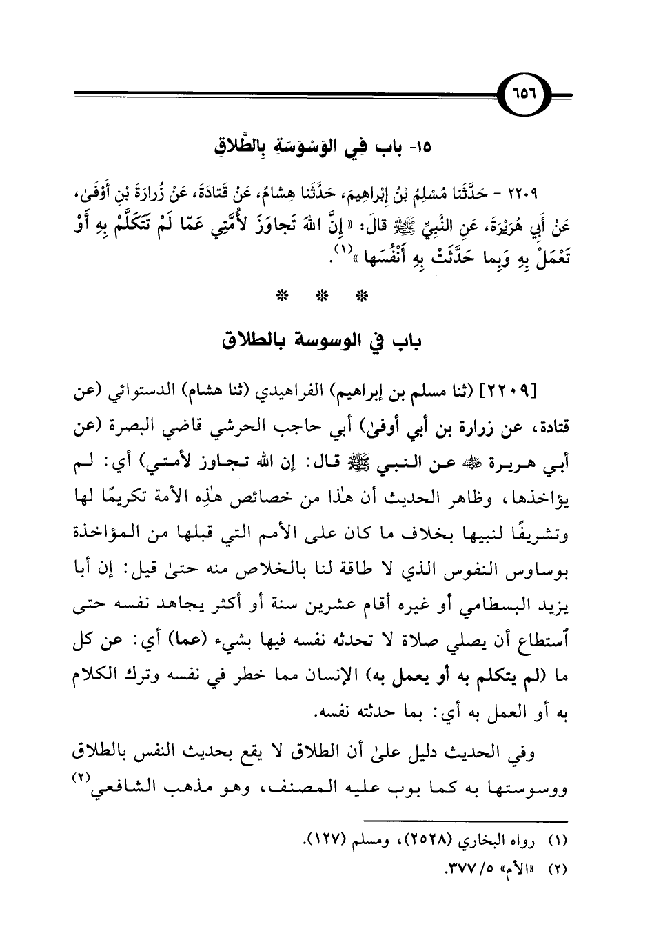 وفي الحديث دليل على أن الطلاق لا يقع بحديث النفس بالطلاق ووسوستها به كما بوب عليه المصنف، وهو مذهب الشافعي (¬2)