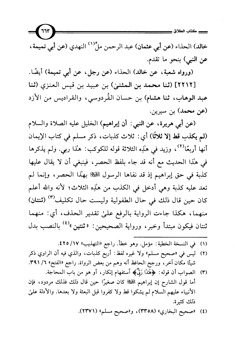 (¬2) ليس في "صحيح مسلم" ولا غيره لفظ: أربع كذبات، والذي فيه أن الراوي ذكر شيئًا مكان آخر، ورجح الحافظ أنه وهم من بعض الرواة. راجع "الفتح" 6/ 391.