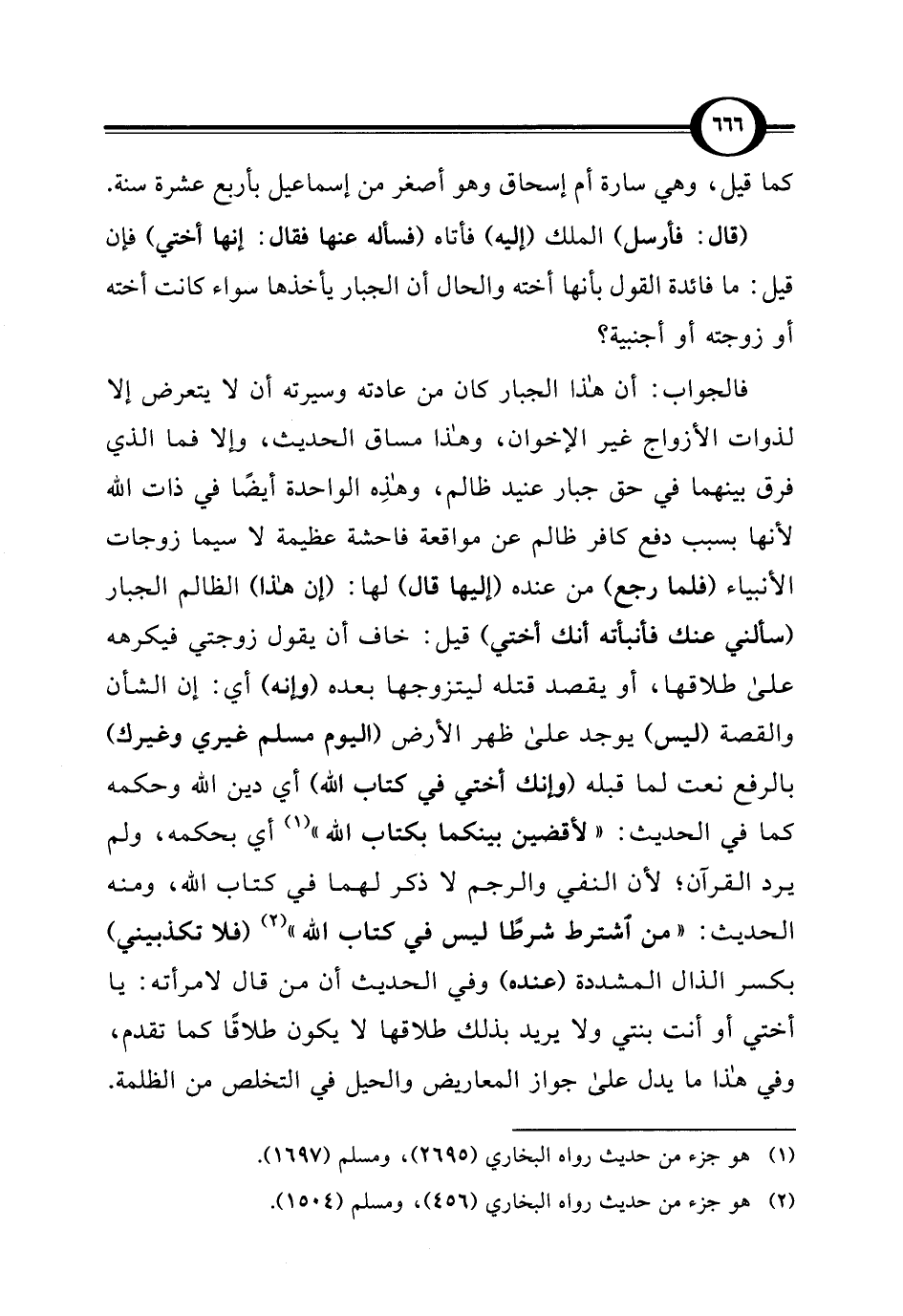 فالجواب: أن هذا الجبار كان من عادته وسيرته أن لا يتعرض إلا لذوات الأزواج غير الإخوان، وهذا مساق الحديث، وإلا فما الذي فرق بينهما في حق جبار عنيد ظالم، وهذِه الواحدة أيضًا في ذات الله لأنها بسبب دفع كافر ظالم عن مواقعة فاحشة عظيمة لا سيما زوجات الأنبياء (فلما رجع) من عنده (إليها قال) لها: (إن هذا) الظالم الجبار (سألني عنك فأنبأته أنك أختي) قيل: خاف أن يقول زوجتي فيكرهه على طلاقها، أو يقصد قتله ليتزوجها بعده (وإنه) أي: إن الشأن والقصة (ليس) يوجد على ظهر الأرض (اليوم مسلم غيري وغيرك) بالرفع نعت لما قبله (وإنك أختي في كتاب الله) أي دين الله وحكمه كما في الحديث: "لأقضين بينكما بكتاب الله" (¬1) أي بحكمه، ولم يرد القرآن؛ لأن النفي والرجم لا ذكر لهما في كتاب الله، ومنه الحديث: "من اشترط شرطًا ليس في كتاب الله" (¬2) (فلا تكذبيني) بكسر الذال المشددة (عنده) وفي الحديث أن من قال لامرأته: يا أختي أو أنت بنتي ولا يريد بذلك طلاقها لا يكون طلاقًا كما تقدم، وفي هذا ما يدل على جواز المعاريض والحيل في التخلص من الظلمة.