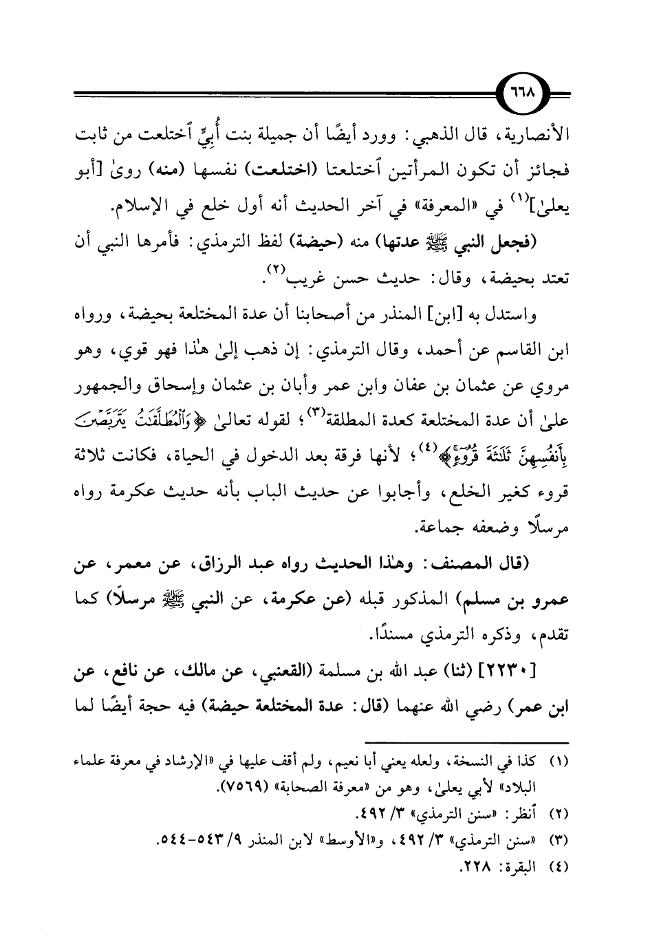 الأنصارية، قال الذهبي: وورد أيضًا أن جميلة بنت أُبِيٍّ اختلعت من ثابت فجائز أن تكون المرأتين اختلعتا (اختلعت) نفسها (منه) روى [أبو يعلى] (¬1) في "المعرفة" في آخر الحديث أنه أول خلع في الإسلام.