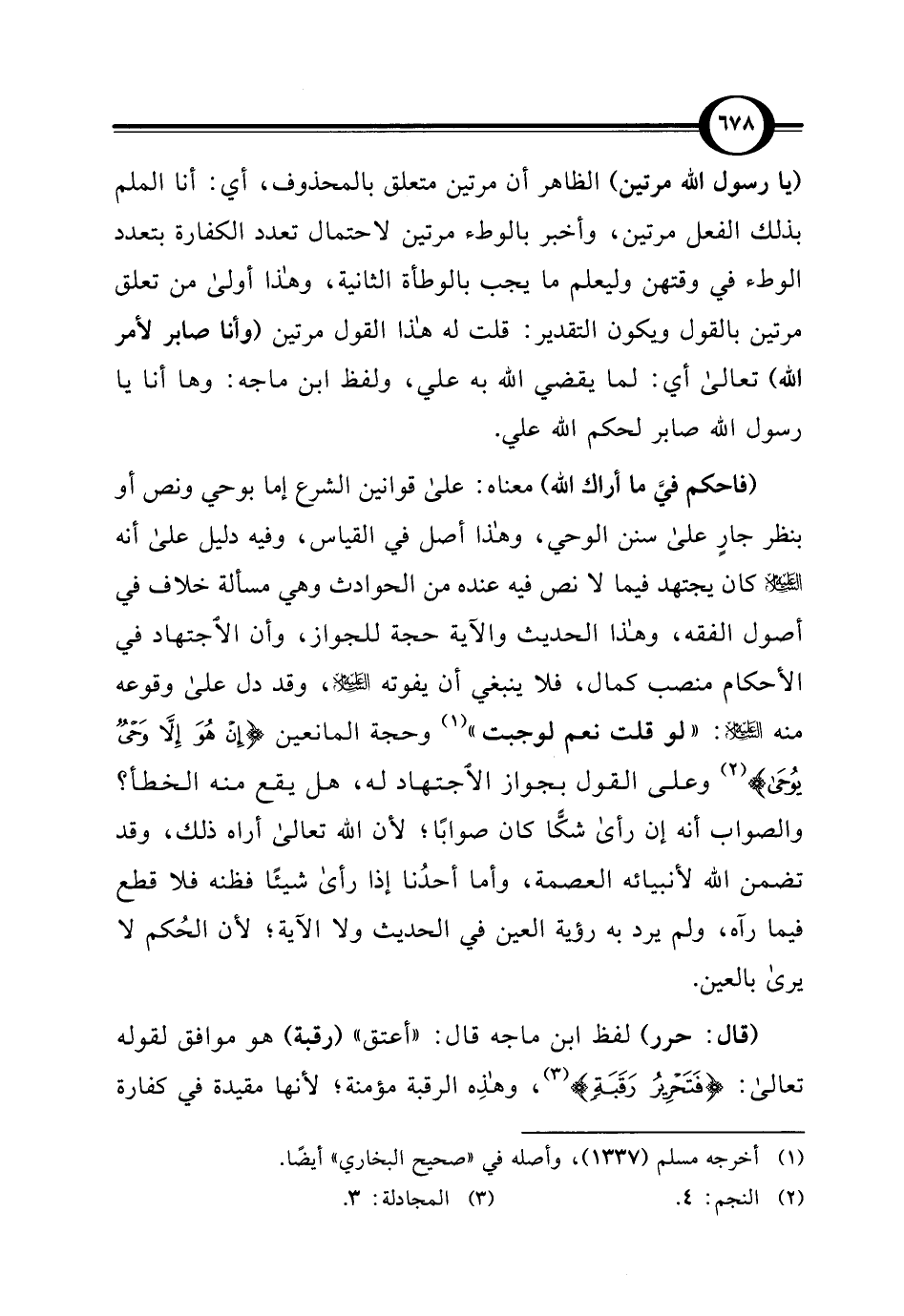 (قال: حرر) لفظ ابن ماجه قال: "أعتق" (رقبة) هو موافق لقوله تعالى: {فَتَحْرِيرُ رَقَبَةٍ} (¬3)، وهذِه الرقبة مؤمنة؛ لأنها مقيدة في كفارة