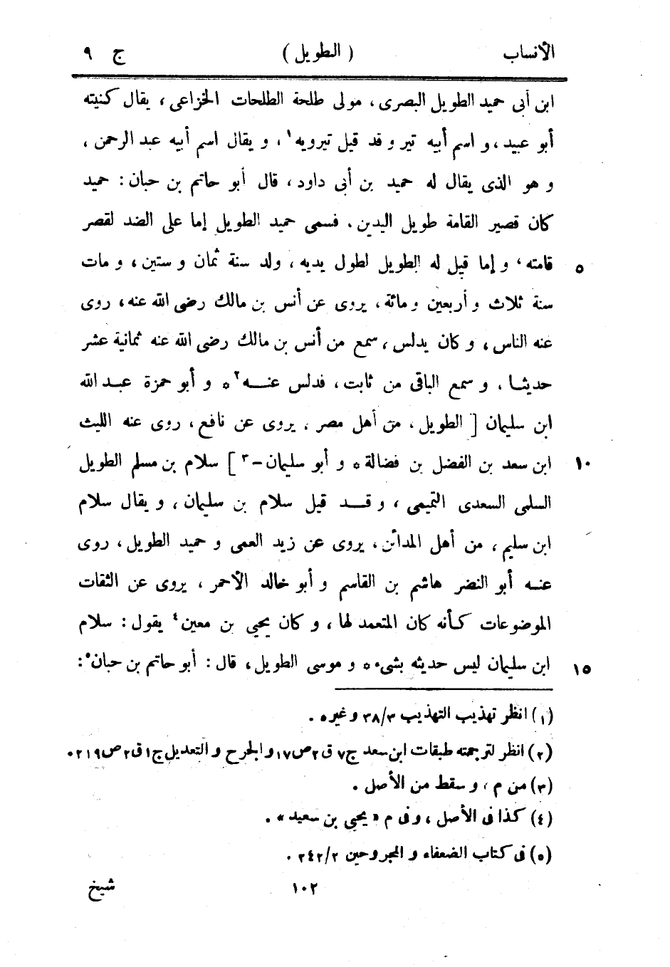 ابن أبى حميد الطويل البصري، مولى طلحة الطلحات الخزاعي، يقال كنيته أبو عبيد، واسم أبيه تير وقد قيل تيرويه [1] ، ويقال اسم أبيه عبد الرحمن، وهو الّذي يقال له حميد بن أبى داود، قال أبو حاتم بن حبان: حميد كان قصير القامة طويل اليدين، فسمى حميد الطويل إما على الضد لقصر قامته، وإما قيل له الطويل لطول يديه، ولد سنة ثمان وستين، ومات سنة ثلاث وأربعين ومائة، يروى عن أنس بن مالك رضى الله عنه، روى عنه الناس، وكان يدلس، سمع من أنس بن مالك رضى الله عنه ثمانية عشر حديثا، وسمع الباقي من ثابت، فدلس عنه [2] وأبو حمزة عبد الله ابن سليمان [الطويل، من أهل مصر، يروى عن نافع، روى عنه الليث ابن سعد بن الفضل بن فضالة وأبو سليمان-[3]] سلام بن مسلم الطويل السلمي السعدي التميمي، وقد قيل سلام بن سليمان، ويقال سلام ابن سليم، من أهل المدائن، يروى عن زيد العمى وحميد الطويل، روى عنه أبو النضر هاشم بن القاسم وأبو خالد الأحمر، يروى عن الثقات الموضوعات كأنه كان المتعمد لها، وكان يحيى بن معين [4] يقول: سلام ابن سليمان ليس حديثه بشيء وموسى الطويل، قال: أبو حاتم بن حبان [5] :