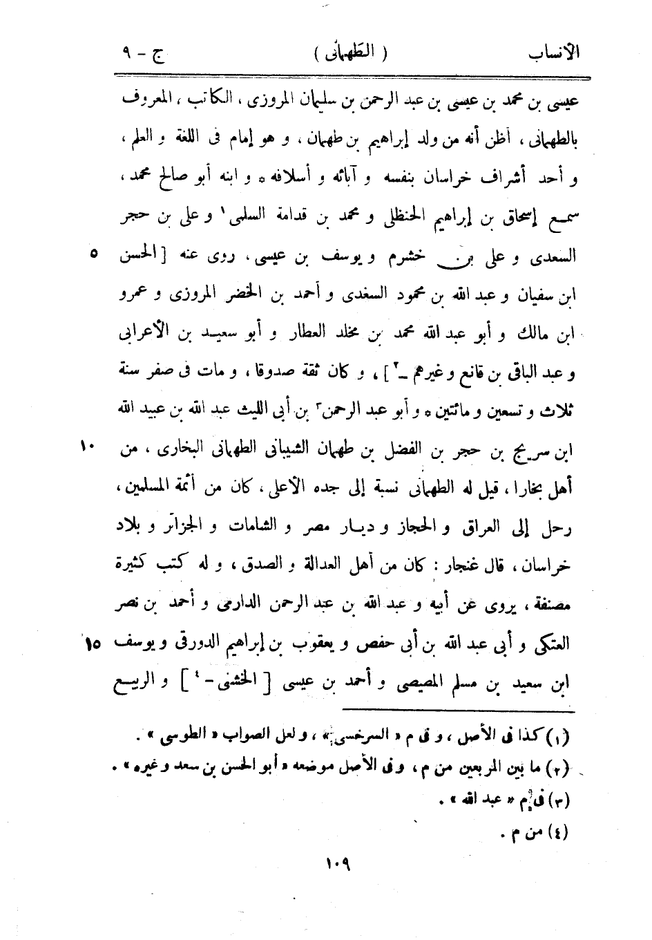 عيسى بن محمد بن عيسى بن عبد الرحمن بن سليمان المروزي، الكاتب، المعروف بالطهمانى، أظن أنه من ولد إبراهيم بن طهمان، وهو إمام في اللغة والعلم، وأحد أشراف خراسان بنفسه وآبائه وأسلافه وابنه أبو صالح محمد، سمع إسحاق بن إبراهيم الحنظليّ ومحمد بن قدامة السلمي [1] وعلى بن حجر السعدي وعلى بن خشرم ويوسف بن عيسى، روى عنه [الحسن ابن سفيان وعبد الله بن محمود السغدى وأحمد بن الخضر المروزي وعمرو ابن مالك وأبو عبد الله محمد بن مخلد العطار وأبو سعيد بن الأعرابي وعبد الباقي بن قانع وغيرهم-[2]] ، وكان ثقة صدوقا، ومات في صفر سنة ثلاث وتسعين ومائتين وأبو عبد الرحمن [3] بن أبى الليث عبد الله بن عبيد الله ابن سريج بن حجر بن الفضل بن طهمان الشيباني الطهمانى البخاري، من أهل بخارا، قيل له الطهمانى نسبة إلى جده الأعلى، كان من أئمة المسلمين، رحل إلى العراق والحجاز وديار مصر والشامات والجزائر وبلاد خراسان، قال غنجار: كان من أهل العدالة والصدق، وله كتب كثيرة مصنفة، يروى عن أبيه وعبد الله بن عبد الرحمن الدارميّ وأحمد بن نصر العتكيّ وأبى عبد الله بن أبى حفص ويعقوب بن إبراهيم الدورقي ويوسف ابن سعيد بن مسلم المصيصي وأحمد بن عيسى [الخشنيّ-[4]] والربيع