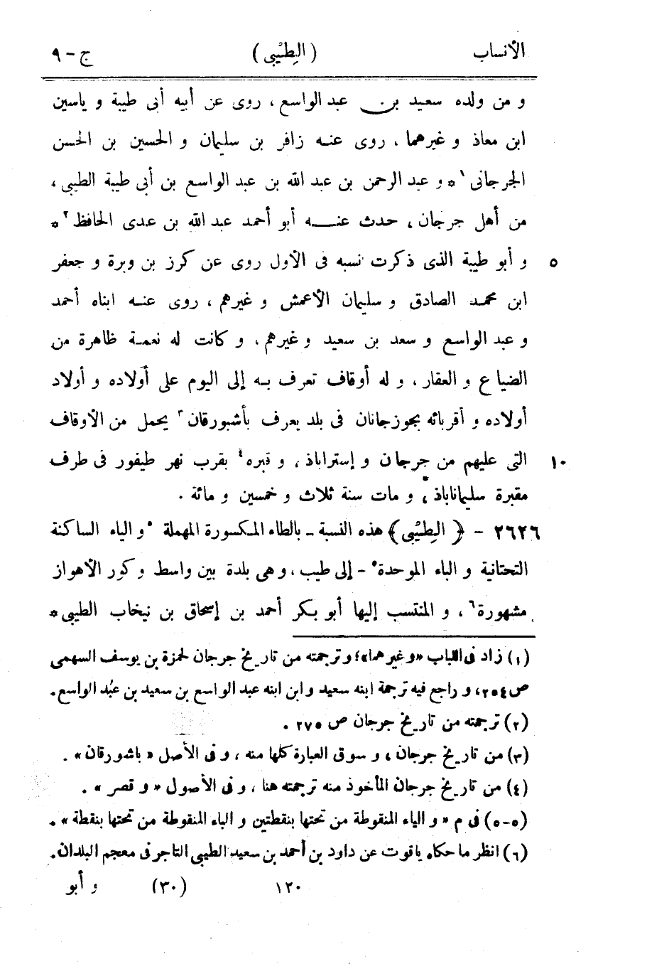 ومن ولده سعيد بن عبد الواسع، روى عن أبيه أبى طيبة وياسين ابن معاذ وغيرهما، روى عنه زافر بن سليمان والحسين بن الحسن الجرجاني [1] وعبد الرحمن بن عبد الله بن عبد الواسع بن أبى طيبة الطيبي، من أهل جرجان، حدث عنه أبو أحمد عبد الله بن عدي الحافظ [2] وأبو طيبة الّذي ذكرت نسبه في الأول روى عن كرز بن وبرة وجعفر ابن محمد الصادق وسليمان الأعمش وغيرهم، روى عنه ابناه أحمد وعبد الواسع وسعد بن سعيد وغيرهم، وكانت له نعمة ظاهرة من الضياع والعقار، وله أوقاف تعرف به إلى اليوم على أولاده وأولاد أولاده وأقربائه بجوزجانان في بلد يعرف بأشبورقان [3] يحمل من الأوقاف التي عليهم من جرجان وأستراباذ، وقبره [4] بقرب نهر طيفور في طرف مقبرة سليماناباذ، ومات سنة ثلاث وخمسين ومائة.