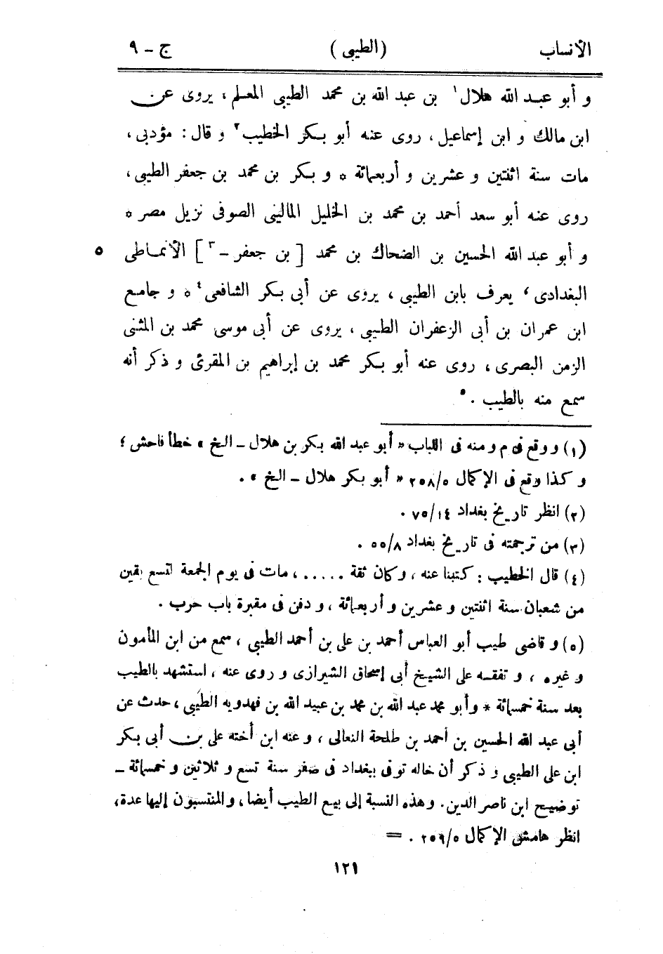[5] وقاضى طيب أبو العباس أحمد بن على بن أحمد الطيبي، سمع من ابن المأمون وغيره، وتفقه على الشيخ أبى إسحاق الشيرازي وروى عنه، استشهد بالطيب بعد سنة خمسمائة وأبو محمد عبد الله بن محمد بن عبيد الله بن فهدويه الطيبي، حدث عن ابى عبد الله الحسين بن أحمد بن طلحة النعالى، وعنه ابن أخته علي بن أبى بكر ابن على الطيبي وذكر أن خاله توفى ببغداد في صفر سنة تسع وثلاثين وخمسمائة- توضيح ابن ناصر الدين وهذه النسبة إلى بيع الطيب أيضا، والمنتسبون إليها عدة، انظر هامش الإكمال 5/ 259.